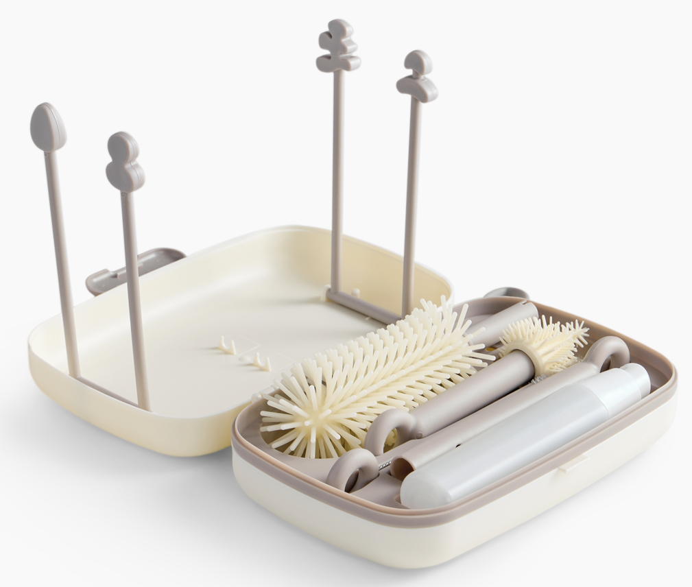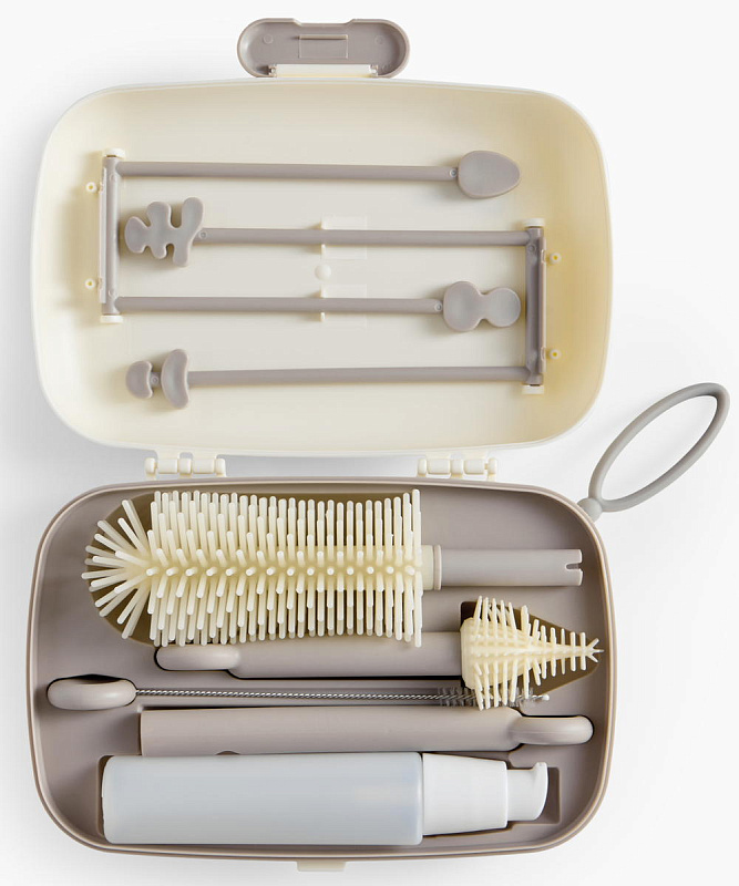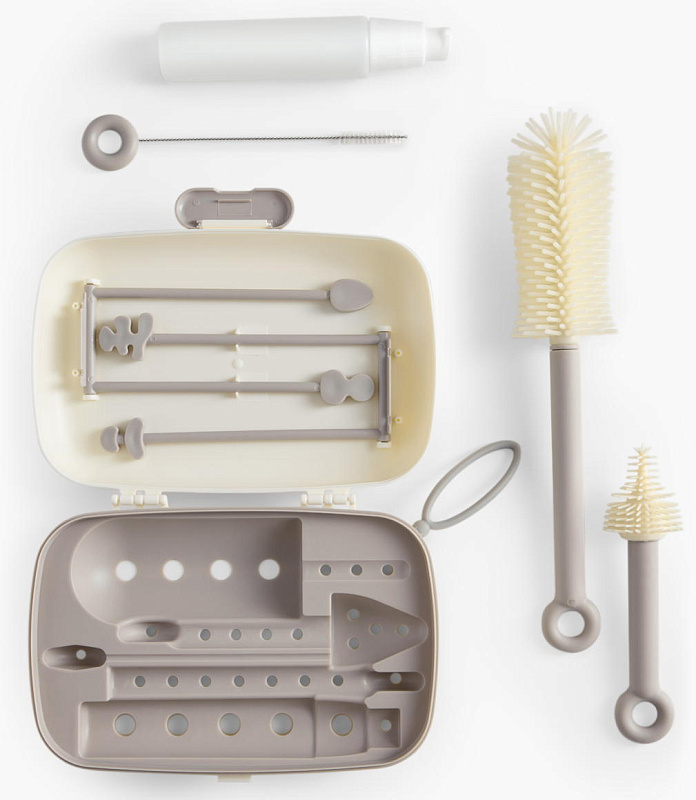 В комплект входят: большой ершик для бутылок, щётка для сосок с гибким наконечником, щётка для трубочек, дозатор для моющего средства на 50 мл, сушилка-контейнер для хранения