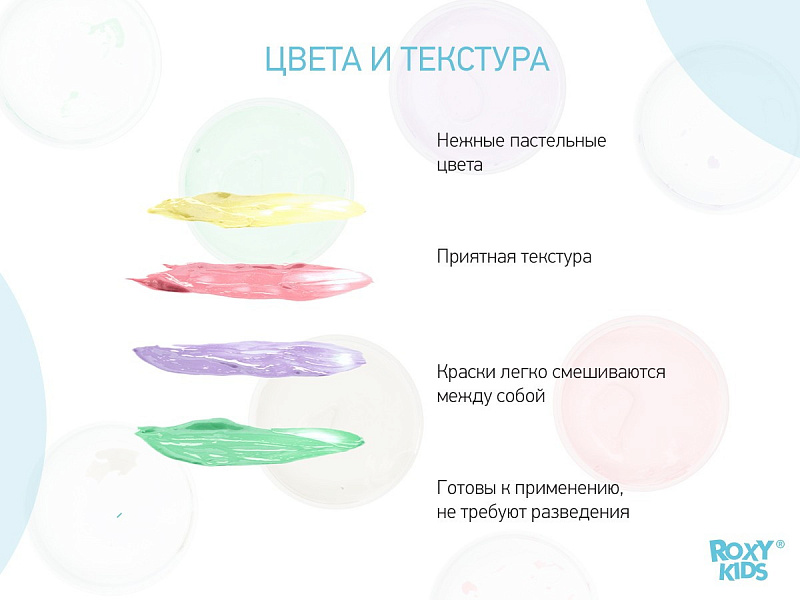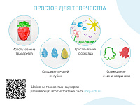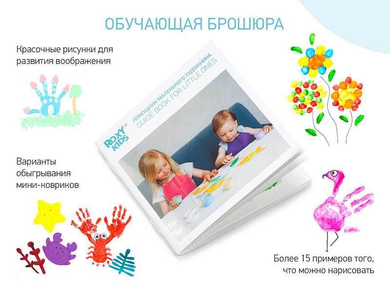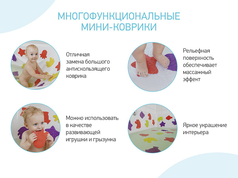 Мини коврики в одном наборе с пальчиковыми красками обеспечат вашему малышу комфорт, безопасность и веселый досуг во время купания. Коврики обладают противоскользящими свойствами, а также выполняют массажную функцию. Они легко и надежно крепятся с помощью присосок на любую гладкую поверхность, при этом не оставляют следов. Пальчиковые краски способствуют развитию тактильных ощущений и образного мышления. С помощью них малыш сможет создавать в ванной свои первые картины. Краски нетоксичны и безопасны для здоровья, изготовлены на растительной основе, а также содержат пищевую горечь, чтобы у малыша не было желания их съесть. Подходят для малышей от 1 года. Насыщенные цвета легко смешиваются между собой. Легко смываются водой. Мини-коврики произведены из термоэластопласта, поэтому не имеют неприятного запаха, а малыш их сможет грызть. Продукция сертифицирована и соответствует стандартам безопасности.