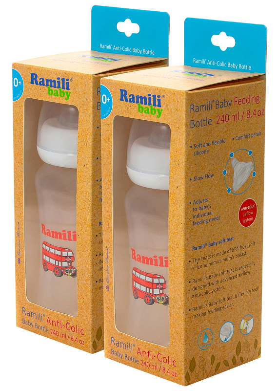 Набор из двух детских бутылочет от английской компании-производителя детских товаров. Идеально подходит для кормления малыша. Бутылочка для кормления оснащена передовой противоколиковой системой подачи воздуха внутрь бутылочки, которая при правильном положении (перпендикулярно лицу) исключает заглатывание воздуха во время кормления ребенка, что является причиной возникновения колик. Уникальная мягкая, адаптируемая соска имитирует форму материнской груди. Бутылочка совместима с молокоотсосами Ramili (SE серии).