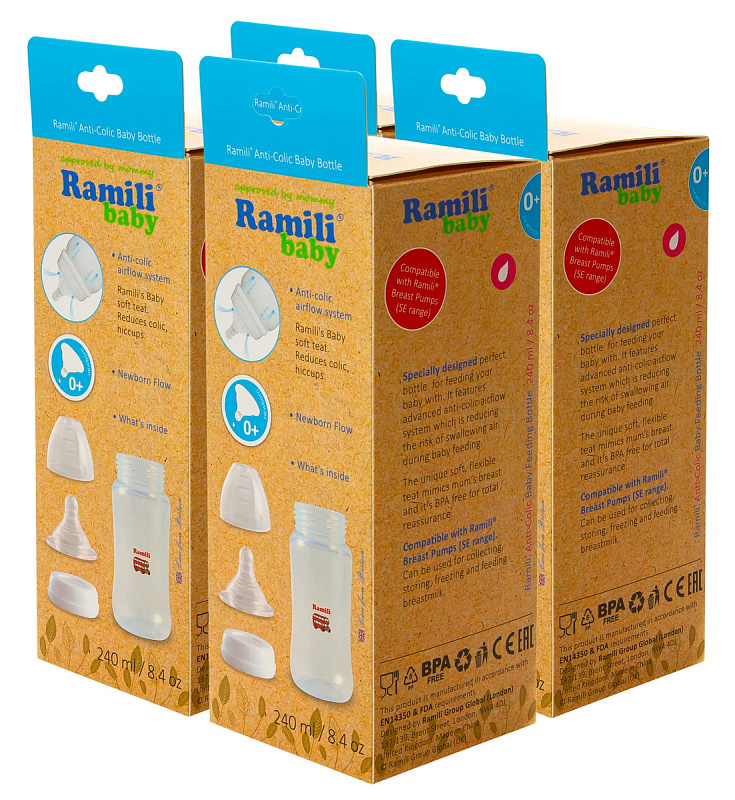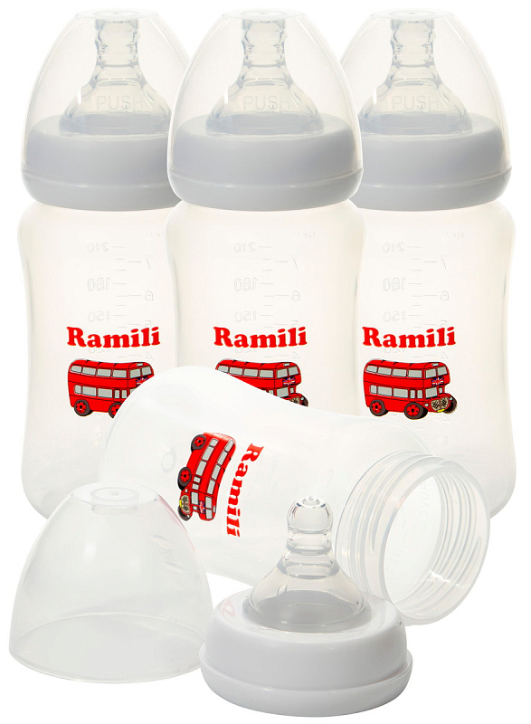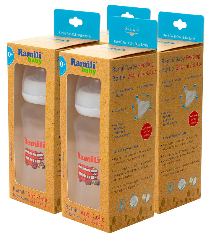 Набор из четырёх детских бутылочет от английской компании-производителя детских товаров. Идеально подходит для кормления малыша. Бутылочка для кормления оснащена передовой противоколиковой системой подачи воздуха внутрь бутылочки, которая при правильном положении (перпендикулярно лицу) исключает заглатывание воздуха во время кормления ребенка, что является причиной возникновения колик. Уникальная мягкая, адаптируемая соска имитирует форму материнской груди. Бутылочка совместима с молокоотсосами Ramili (SE серии).