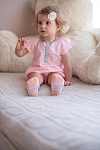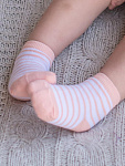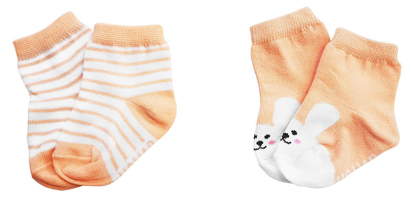 Нежно-персиковый и белый цвет изделий в сочетании с красочным рисунком выглядит очень привлекательно. Комплект состоит из 2 пар, которые отличаются по дизайну с выдержанной цветовой гаммой: полоска и забавные мордашки зайчиков. Текстура очень мягкая, нежная, что гарантирует вашему малышу комфорт при носке. Резинка совершенно не стягивает ножку, но при этом отлично фиксирует.