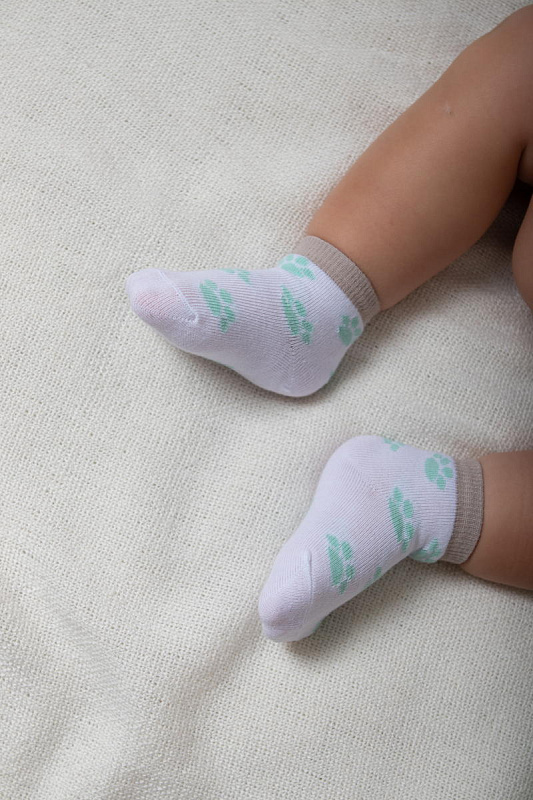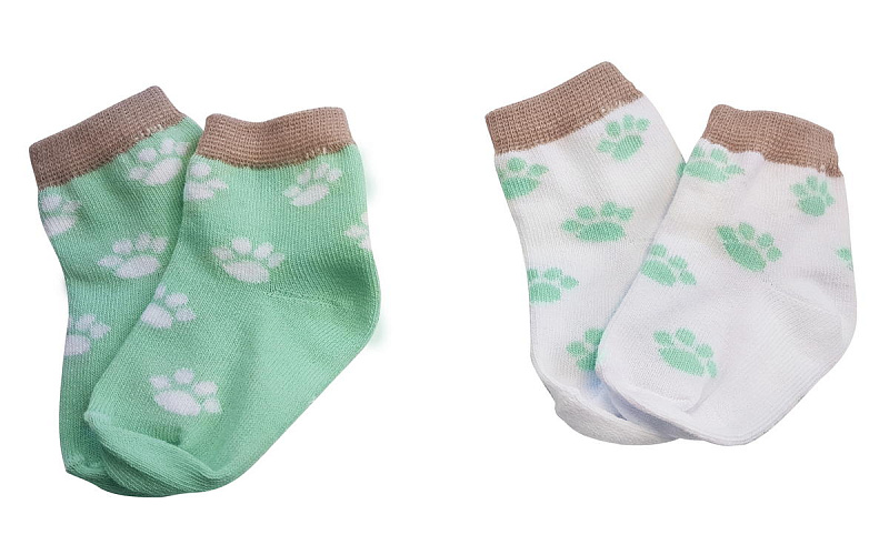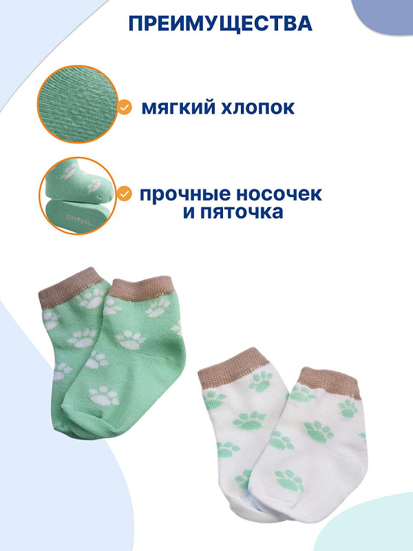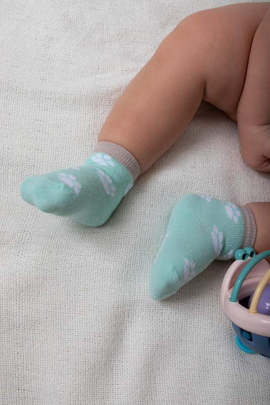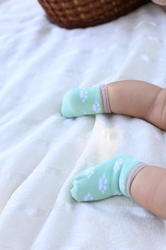 Нежно-мятный и белый цвет изделий в сочетании с красочным рисунком выглядит очень привлекательно. Комплект состоит из 2 пар, которые отличаются по цветовой гамме. Забавный рисунок на носочках в виде лапок животных, привлечет внимание вашего крохи. Текстура очень мягкая, нежная, что гарантирует вашему малышу комфорт при носке. Резинка совершенно не стягивает ножку, но при этом отлично фиксирует.