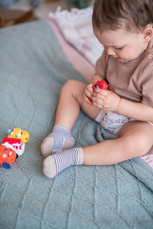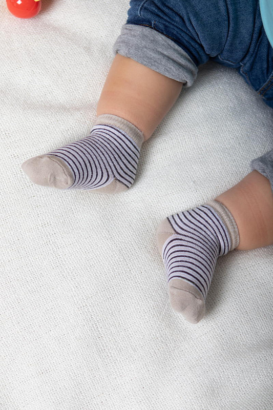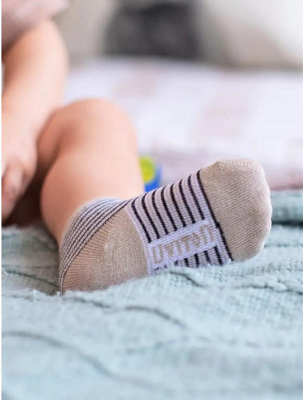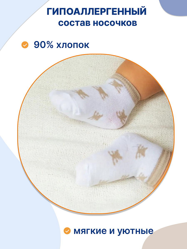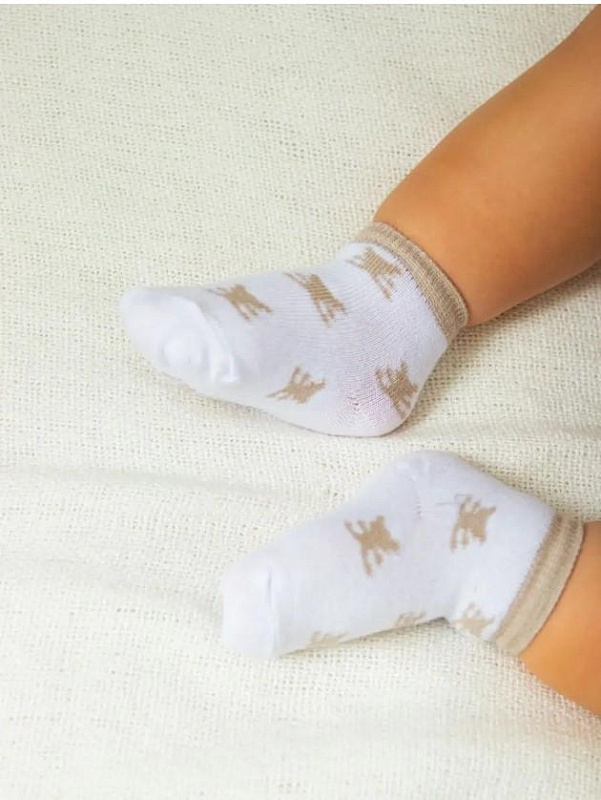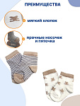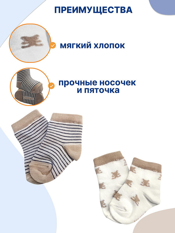 Нежно-бежевый и белый цвет изделий в сочетании с красочным рисунком выглядит очень привлекательно. Комплект состоит из 2 пар, которые отличаются по дизайну с выдержанной цветовой гаммой: полоска и забавные мишки. Текстура очень мягкая, нежная, что гарантирует вашему малышу комфорт при носке. Резинка совершенно не стягивает ножку, но при этом отлично фиксирует.