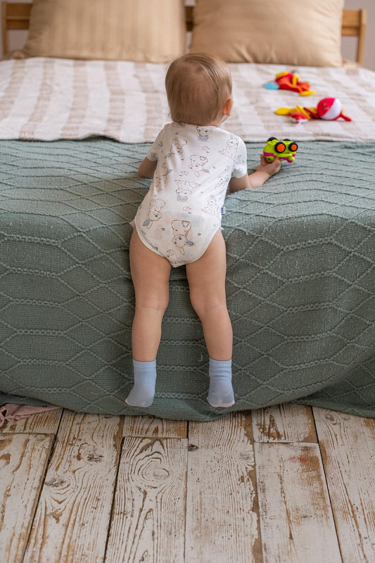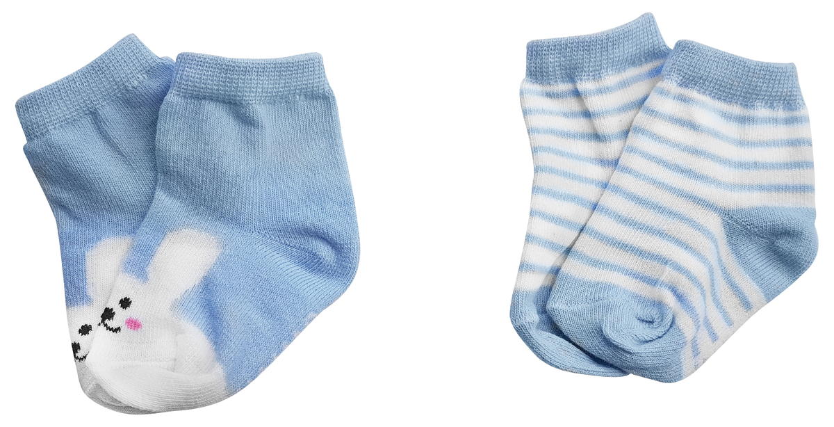 Нежно-голубой и белый цвет изделий в сочетании с красочным рисунком выглядит очень привлекательно. Комплект состоит из 2 пар, которые отличаются по дизайну с выдержанной цветовой гаммой: полоска и забавные мордашки зайчиков. Текстура очень мягкая, нежная, что гарантирует вашему малышу комфорт при носке. Резинка совершенно не стягивает ножку, но при этом отлично фиксирует.