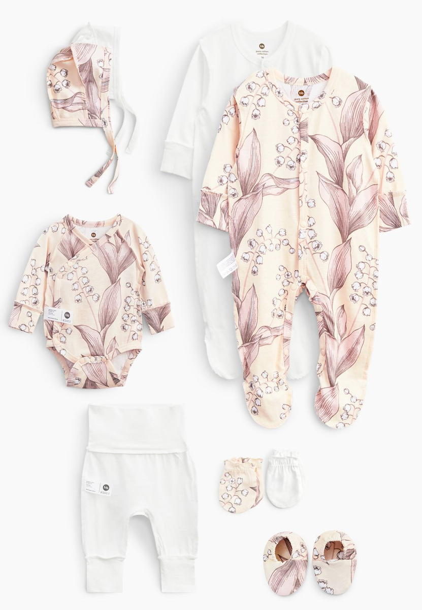 Набор из 9 предметов одежды включает всё необходимое для новорожденного. Комбинезоны, боди и штанишки легко надевать на нежного малыша, не причинив ему дискомфорт и не потревожив пупочную ранку. Лекало создавалось с учетом анатомии детей первого года жизни – в одежде удобно спать, двигаться, осваивать новые умения. Свободная посадка не сковывает движения, есть пространство под подгузник. Комбинезоны и боди оснащены антицарапками. В дополнение к ним в наборе 2 вида рукавичек для малыша. Нежные пинетки и милые чепчики с ушками завершат образ и защитят малыша от холода и сквозняков. Набор 56 размера будет впору даже крупным малышам. Стильный набор из 100% хлопка станет идеальным подарком для новорожденного любого пола.