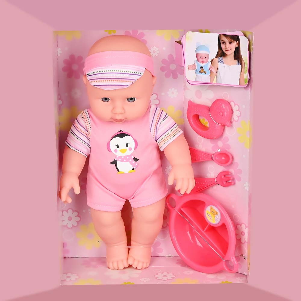 - в наборе: пупс в одежде, игрушка-погремушка, тарелка, ложка, вилка