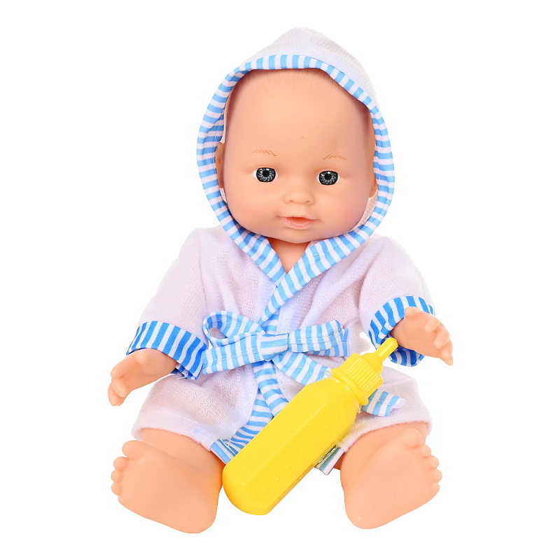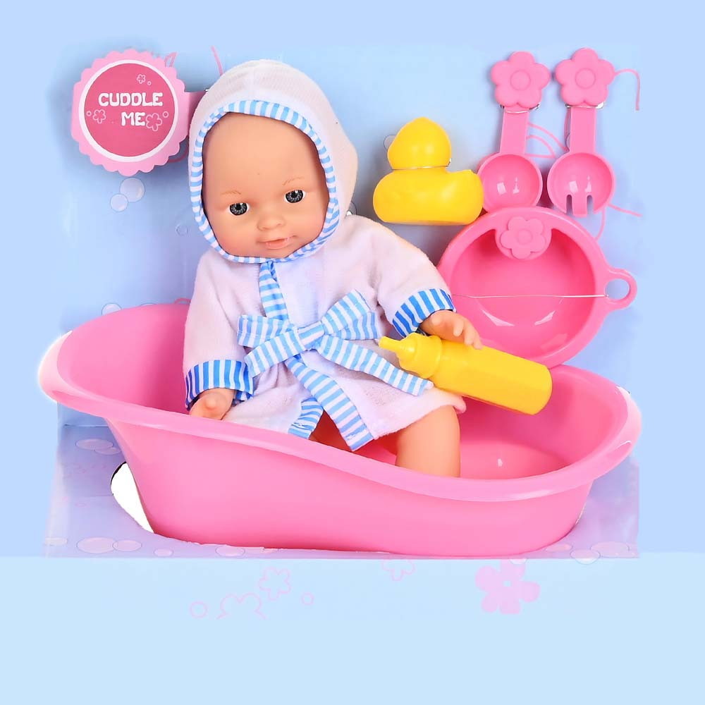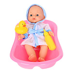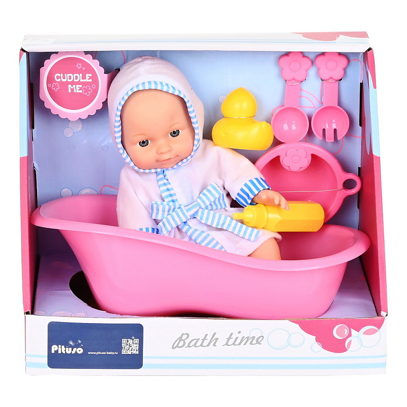 • в наборе: пупс в халате, ваночка, бутылочка для кормления, уточка, 2 ложки
