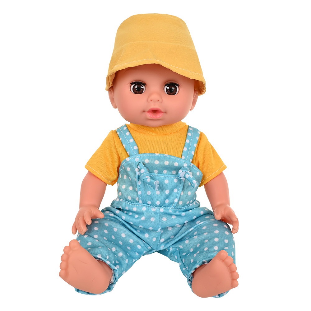 Симпатичный пупс в желтой шапочке порадует вашу малышку и доставит ей много удовольствия от часов, посвященных игре с ней. Кукла изготовлена из мягкой пластмассы. Этот малыш очень послушный: его легко приучить к гигиене, достаточно напоить пупса из бутылочки водой, а затем посадить на розовый горшок. Усадив в стул пупса можно покормить из ложечки. Куклу можно взять с собой на прогулку усадив его в прогулочную коляску. После прогулки он может отдохнуть в своей собственной кроватке.