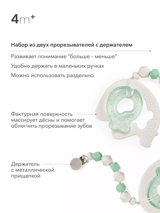 Фактурный набор из двух прорезывателей поможет отвлечь малыша в неприятные моменты периода прорезывания зубов.