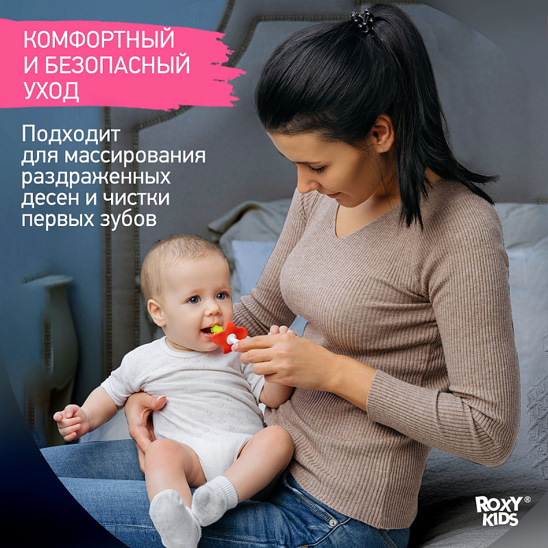 Набор зубных щеток-прорезывателей FLOWER от ROXY-KIDS предназначен для комфортного и безопасного ухода за полостью рта ребенка с первых месяцев жизни. Подходит для массирования раздраженных десен и чистки первых зубов. Ограничитель защищает малыша от заглатывания, снимается при необходимости Рельефная поверхность обеспечивает бережный массаж десен. Элементы разной степени жесткости, мягкий массажер и более жесткий ограничитель. Ребенок сам выбирает, какой элемент ему нравится грызть. Удобно хранить на присоске на различных поверхностях. Массажеры легкие и удобно ложатся в маленькую детскую ручку. Ребенок самостоятельно держит грызунок, мелкая моторика развивается быстрее. Ручка удобна и для взрослых, которые захотят почистить малышу его первые зубки. Прорезыватели просты в уходе, не скапливают на себе пыль, достаточно промыть теплой водой. Набор сертифицирован, материал гипоаллергенен и безопасен для детей.