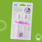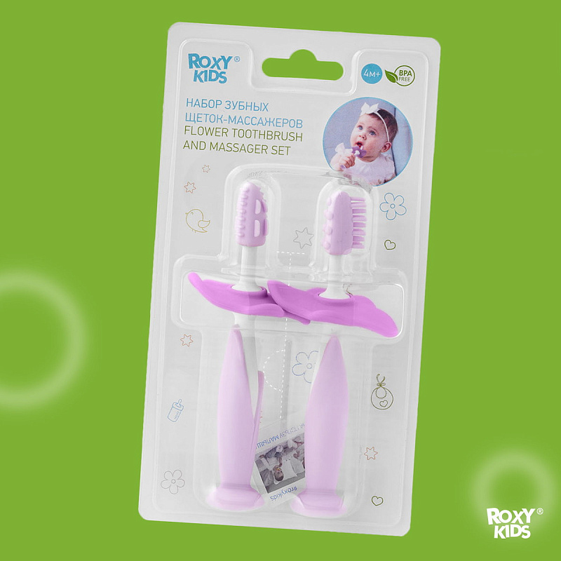 Набор зубных щеток-прорезывателей FLOWER от ROXY-KIDS предназначен для комфортного и безопасного ухода за полостью рта ребенка с первых месяцев жизни. Подходит для массирования раздраженных десен и чистки первых зубов. Ограничитель защищает малыша от заглатывания, снимается при необходимости Рельефная поверхность обеспечивает бережный массаж десен. Элементы разной степени жесткости, мягкий массажер и более жесткий ограничитель. Ребенок сам выбирает, какой элемент ему нравится грызть. Удобно хранить на присоске на различных поверхностях. Массажеры легкие и удобно ложатся в маленькую детскую ручку. Ребенок самостоятельно держит грызунок, мелкая моторика развивается быстрее. Ручка удобна и для взрослых, которые захотят почистить малышу его первые зубки. Прорезыватели просты в уходе, не скапливают на себе пыль, достаточно промыть теплой водой. Набор сертифицирован, материал гипоаллергенен и безопасен для детей.