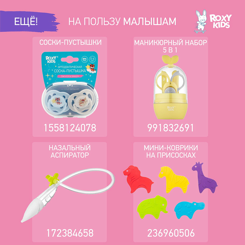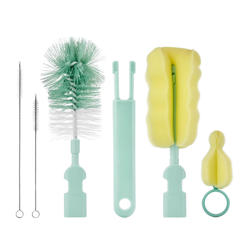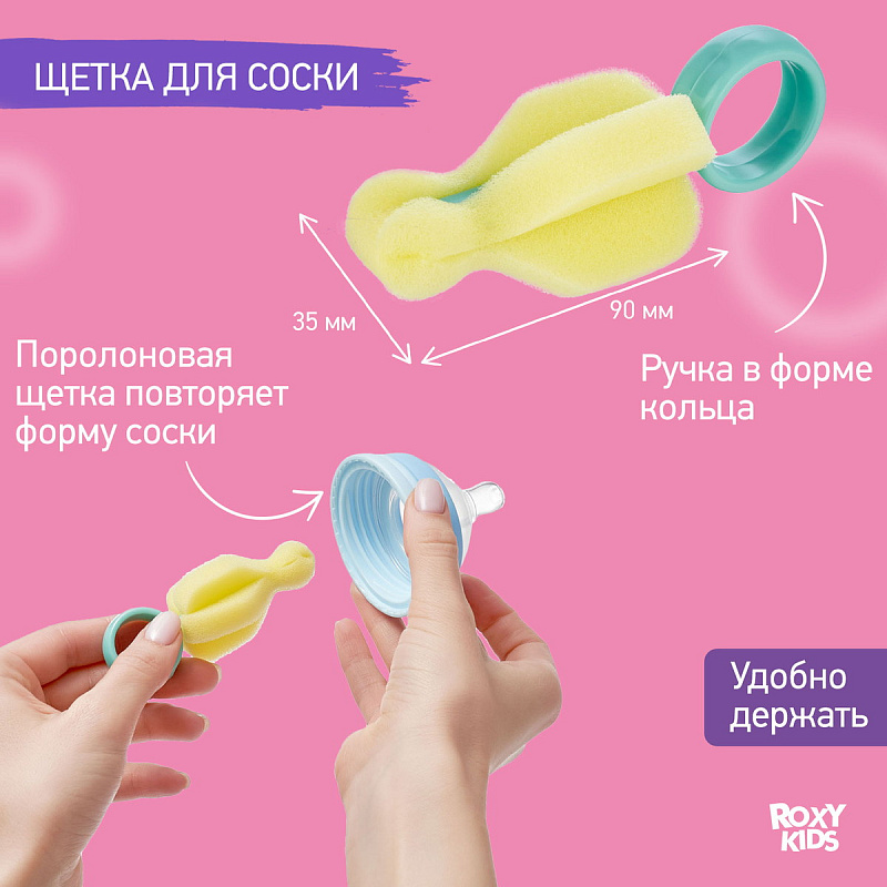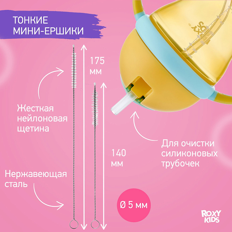 Набор щеток и ершиков ROXY-KIDS разработан специально для мытья бутылочек, трубочек, сосок и помогает сделать эту ежедневную процедуру максимально быстрой и удобной. В состав набора входят две сменные насадки для мытья бутылочек, маленькая щетка для соски и два мини-ершика для чистки трубочек. Классический жесткий ершик и мягкая поролоновая щетка предназначены для загрязнений разной степени. Они легко меняются и надежно защелкиваются на эргономичной рукоятке. Длина рукоятки 30 см позволяет почистить даже самые высокие бутылочки. Маленькая щетка повторяет форму соски, а ручку в форме кольца удобно держать, надев на палец. Мини-ершик – незаменимый инструмент для очистки силиконовых трубочек от остатков напитков. Он имеет оптимальный диаметр 5 мм и долговечную жесткую нейлоновую щетину.