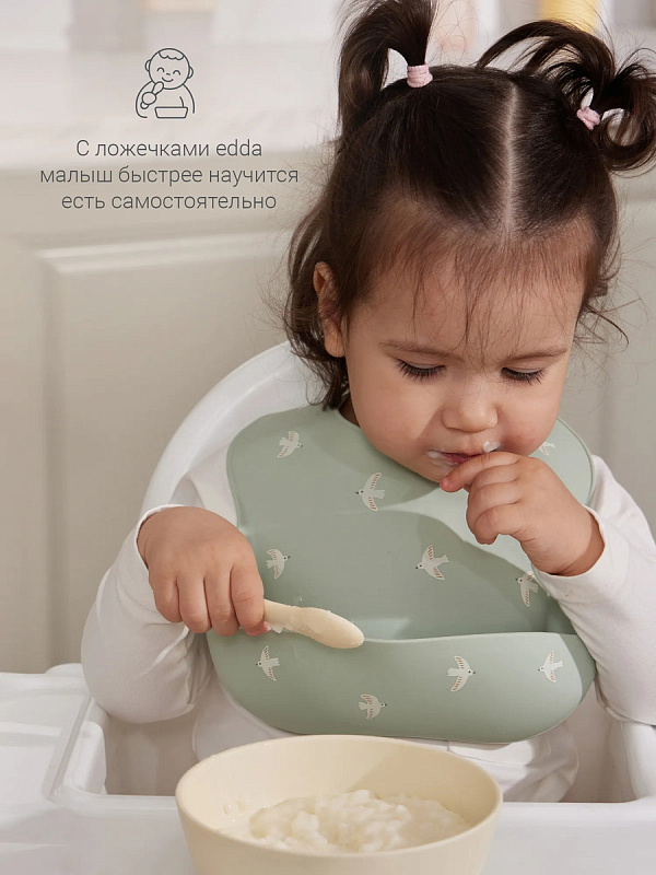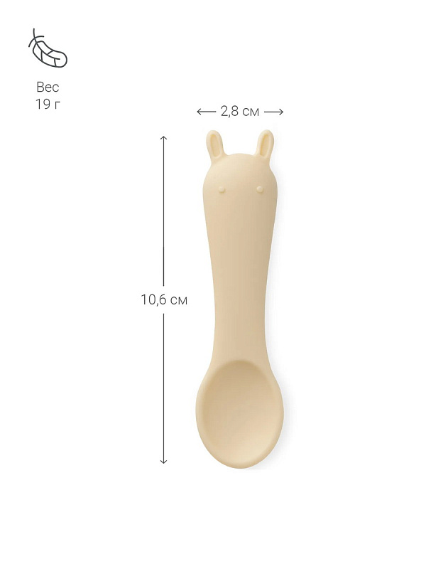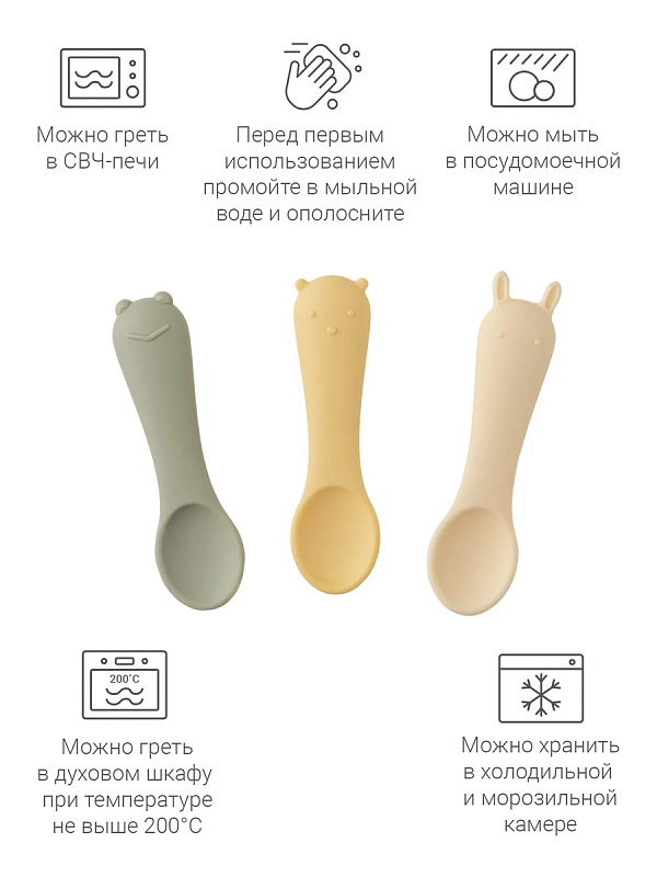 Размер и форма ложки разработаны с учетом физиологии малышей для лучшего захвата, поэтому она удобно ложится в ладошку малыша. Ложечки бесшумны во время еды, и просты в уходе: их можно мыть в посудомоечной машине, они выдерживают высокие температуры и подходит для СВЧ-печи.
