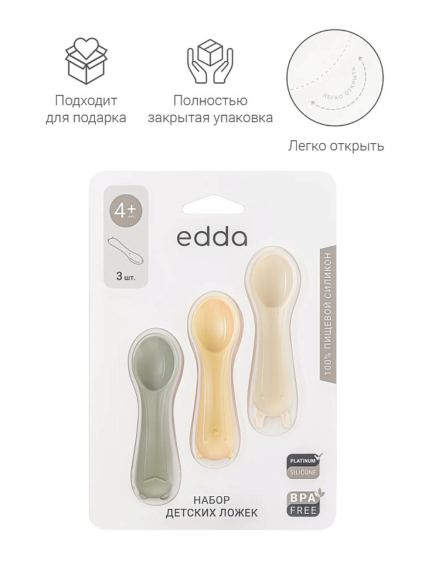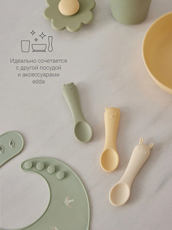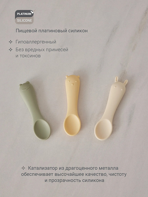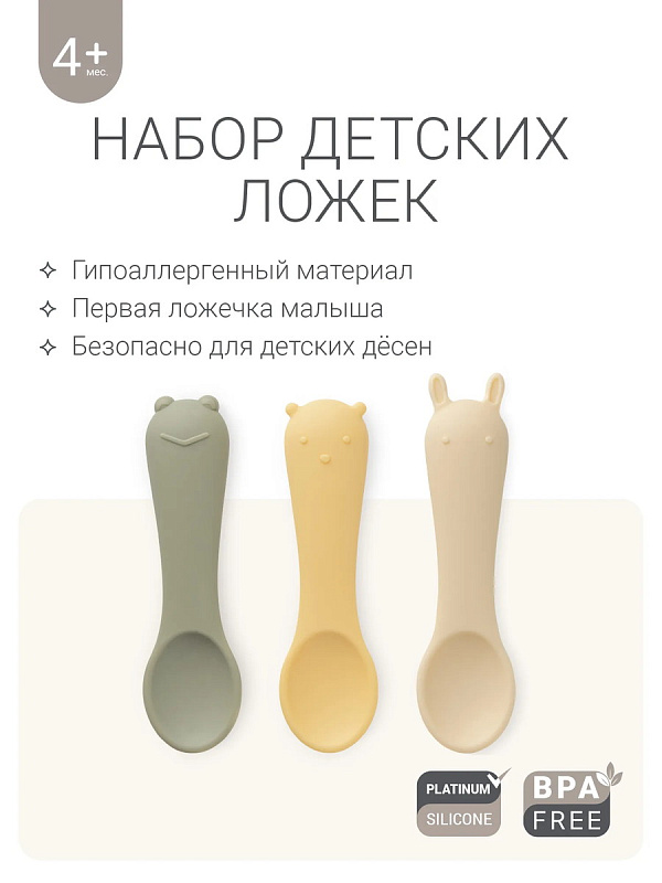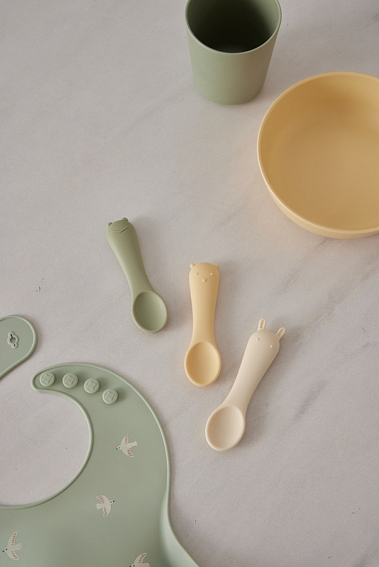 Оригинальный дизайн в форме забавных зверей привносит элемент игры в ежедневное кормление. В наборе — три ложки в трёх разных оттенках: шалфей, пломбир и пудра. Ложки гармонично сочетаются со всей посудой бренда по цветам и минималистичному дизайну.