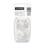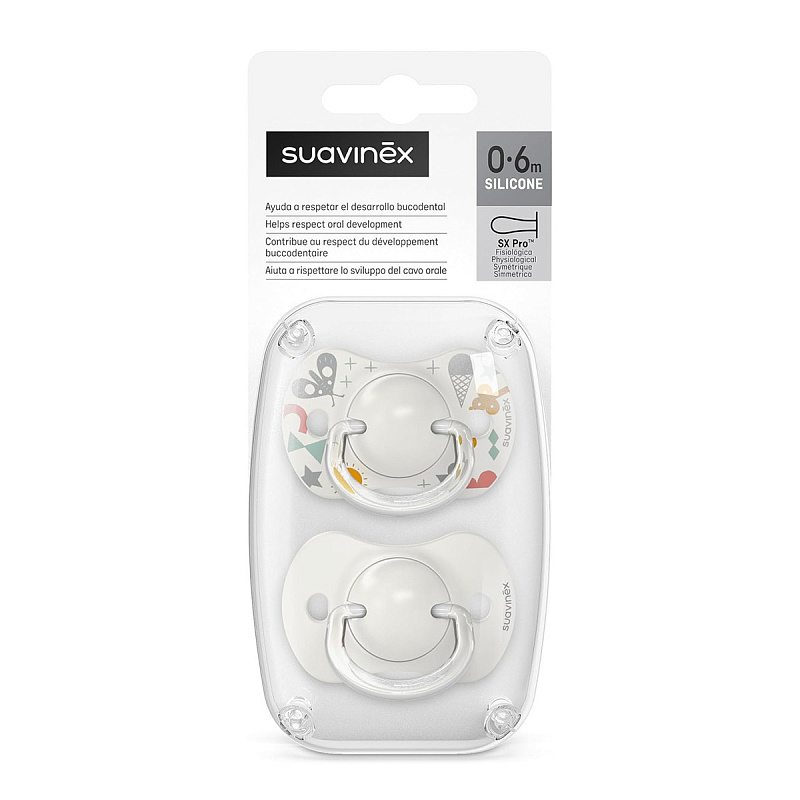 Пустышка Suavinex с физиологической силиконовой соской SX Pro. Она анатомически правильно располагается во рту ребенка, не препятствуя естественному развитию ротовой полости и прикуса. Корпус пустышки имеет специальные вентиляционные отверстия и не вызывает раздражания в периоральной зоне.