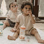 - Ультрамягкий тонкий силикон с фактурным покрытием имитирует ощущение и текстуру материнского соска, обеспечивает идеальную гибкость пустышки