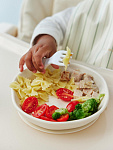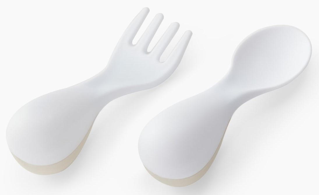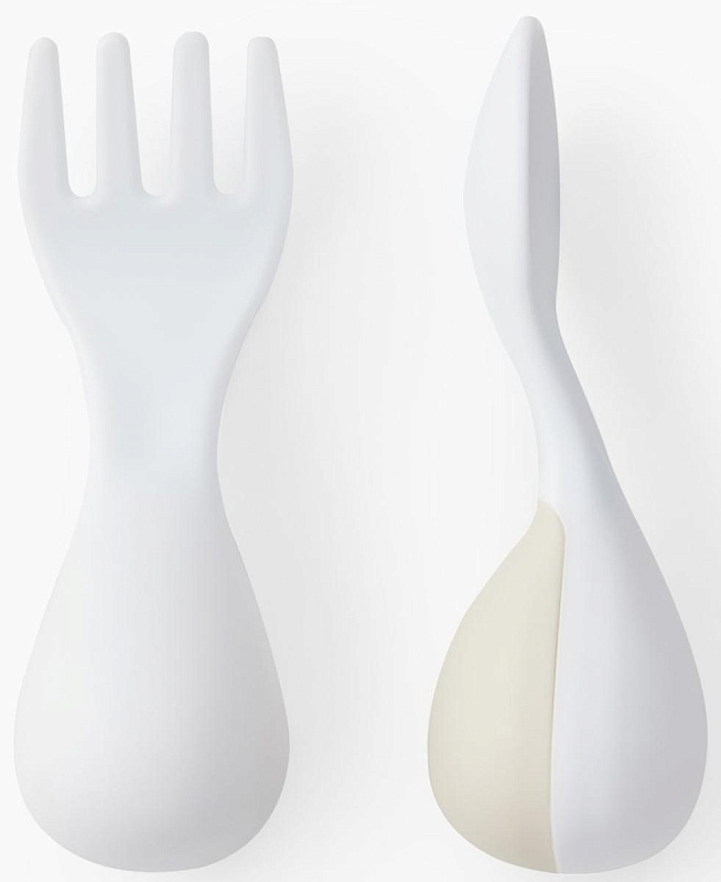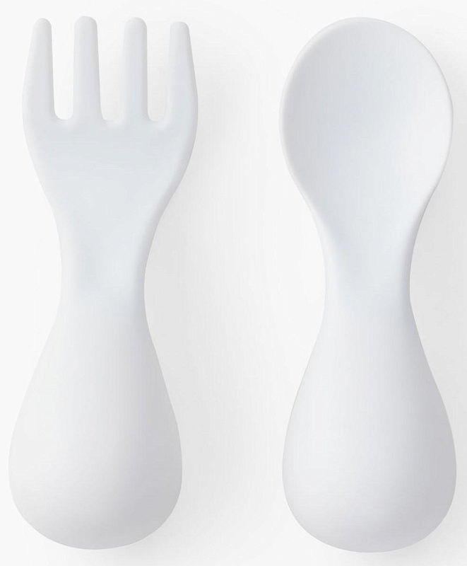 Набор из ложки и вилки особой формы станет незаменимым атрибутом для приучения ребёнка к самостоятельному приему пищи. Глубокая ложечка удобна для зачерпывания жидкой пищи, а вилочка сделана с закруглёнными концами для дополнительной безопасности малыша. Собственные столовые приборы стимулируют малыша учиться кушать самому.