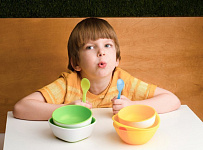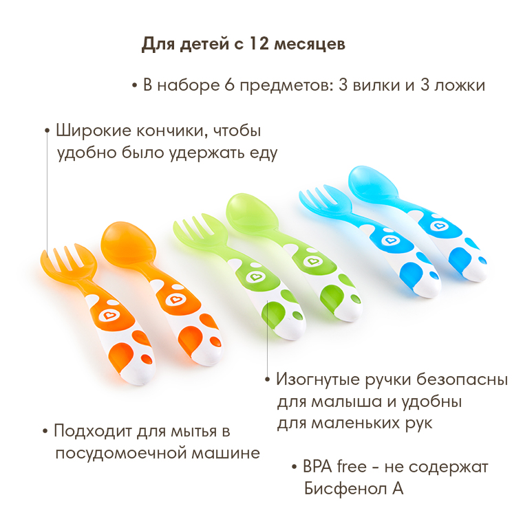 Набор включает в себя 3 вилки и 3 ложки, которые предназначены для самостоятельного кормления ребёнка.