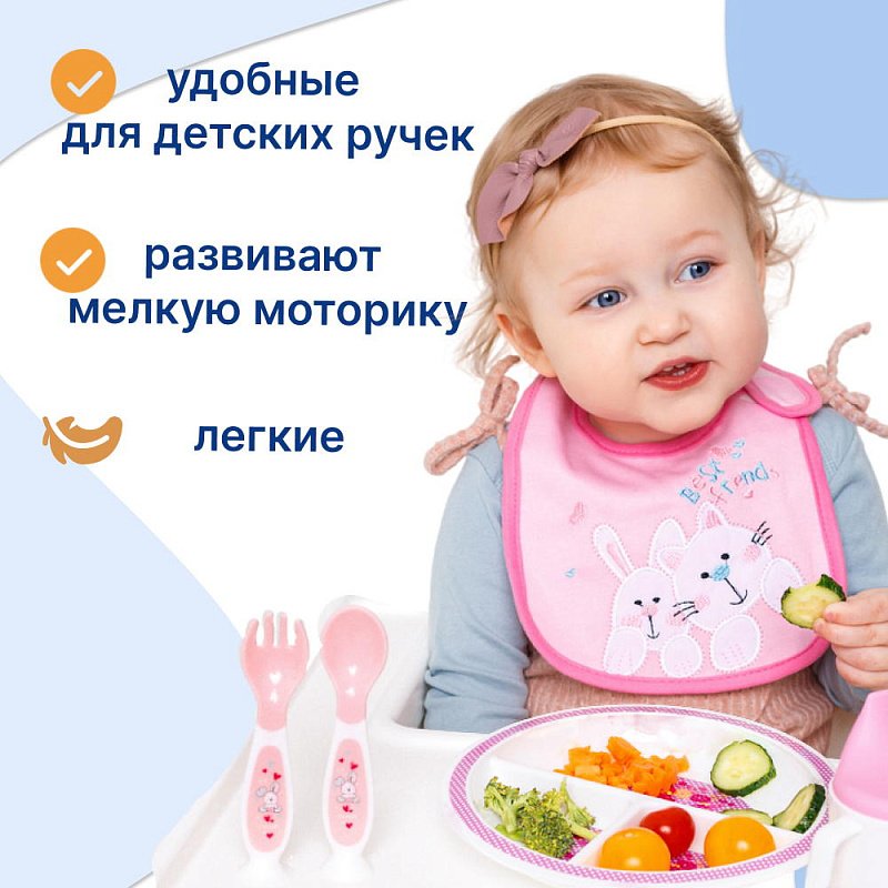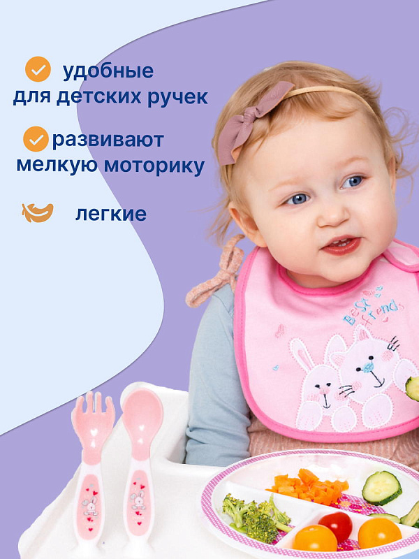 Набор для малыша который начинает учится кушать самостоятельно ложечка и вилочка от Uviton. В наборе два прибора: вилочка с безопасными закругленными зубчиками и ложечка. Ручки столовых приборов имеют эргономичную форму, специальные антискользящие вставки и присоску.