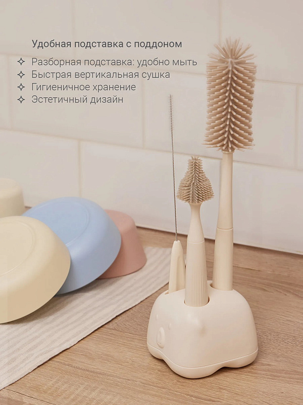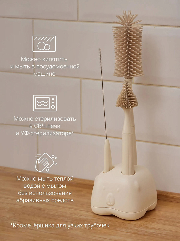 Материал изготовленияёршики для бутылочек и мытья сосок — пищевой силикон, полипропилен; щёточка для трубочек — нейлон, нержавеющая сталь, полипропилен; подставка с поддоном для сбора воды — АБС-пластик