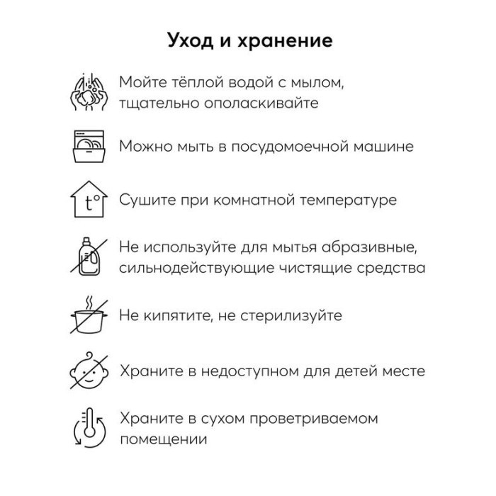 • Мыть теплой водой с мылом или в посудомоечной машине, тщательно ополаскивать.