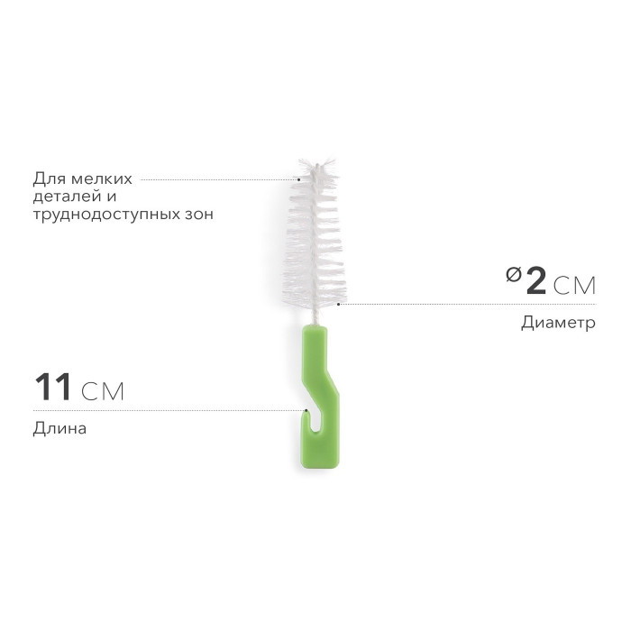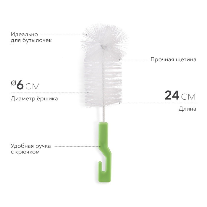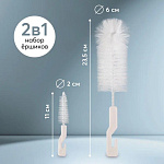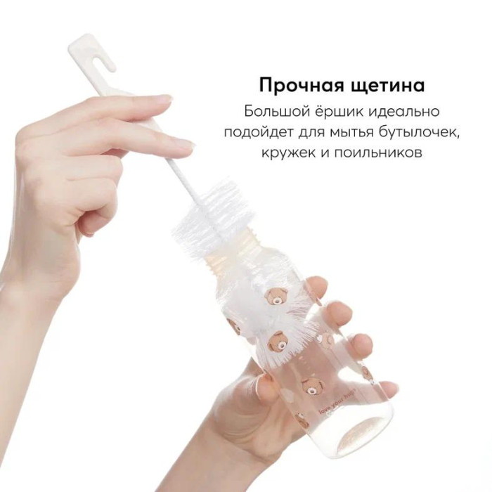 В набор входят два ёршика, чтобы безопасно и без царапин очищать бутылочки для кормления (большой ёршик) и соски (маленький ёршик). Ручки ёршиков снабжены крючками для удобства подвешивания.