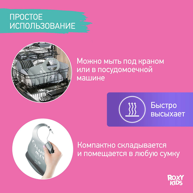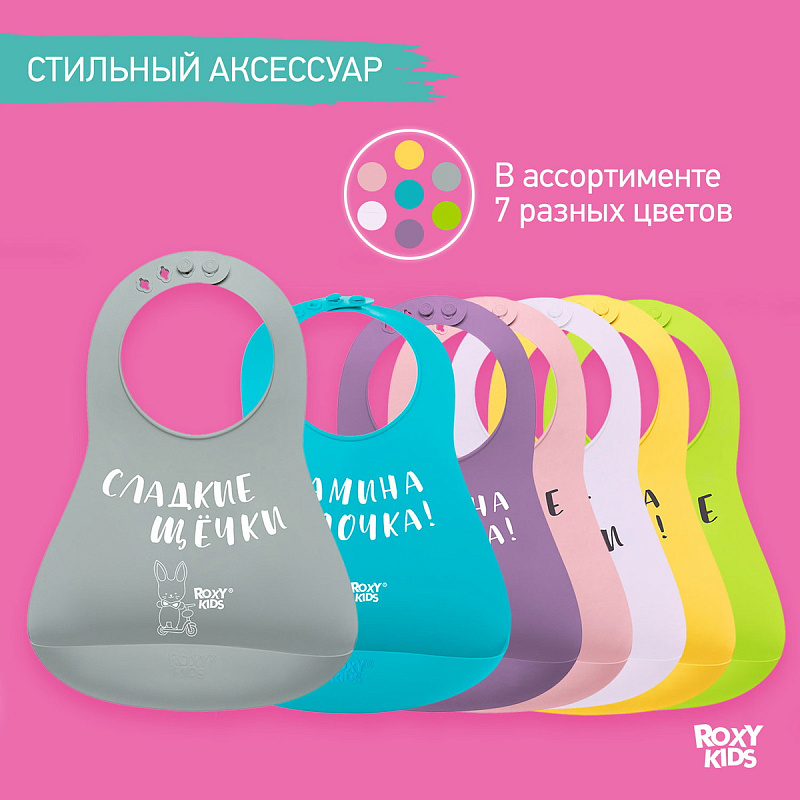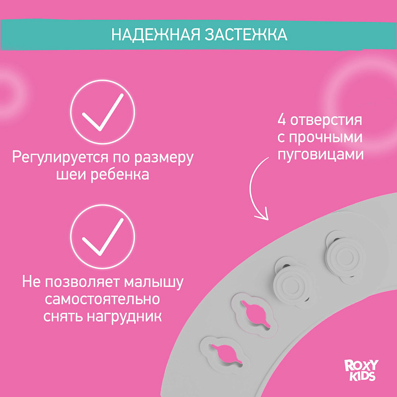 Нагрудник детский с карманом надежно защитит одежду вашего малыша от загрязнений и сохранит чистоту в доме. Мягкий на ощупь, но прочный материал не поцарапает и не натрет нежную шею ребенка. Нагрудник не впитывает запахи и легко моется даже в посудомоечной машине при температуре не больше 80 градусов Цельсия. Отличительной особенностью этого нагрудника является особая надежная застежка, которая позволяет регулировать размер аксессуара, а также не даст ребенку самостоятельно снять нагрудник с себя. Глубокий карман для крошек предназначен для того, чтобы еда не оказалась на столе или на полу. Эргономичная форма повторяет очертания тела малыша. Изготовлен полностью из гипоаллергенного материала. При необходимости слюнявчик можно легко свернуть в трубочку и взять с собой. Материал не деформируется в процессе использования. В ассортименте ROXY-KIDS данный нагрудник представлен в нескольких цветах.