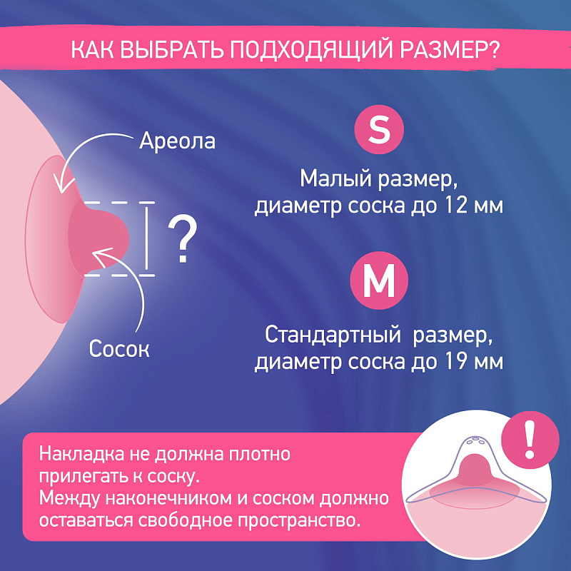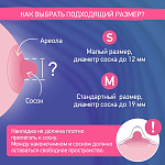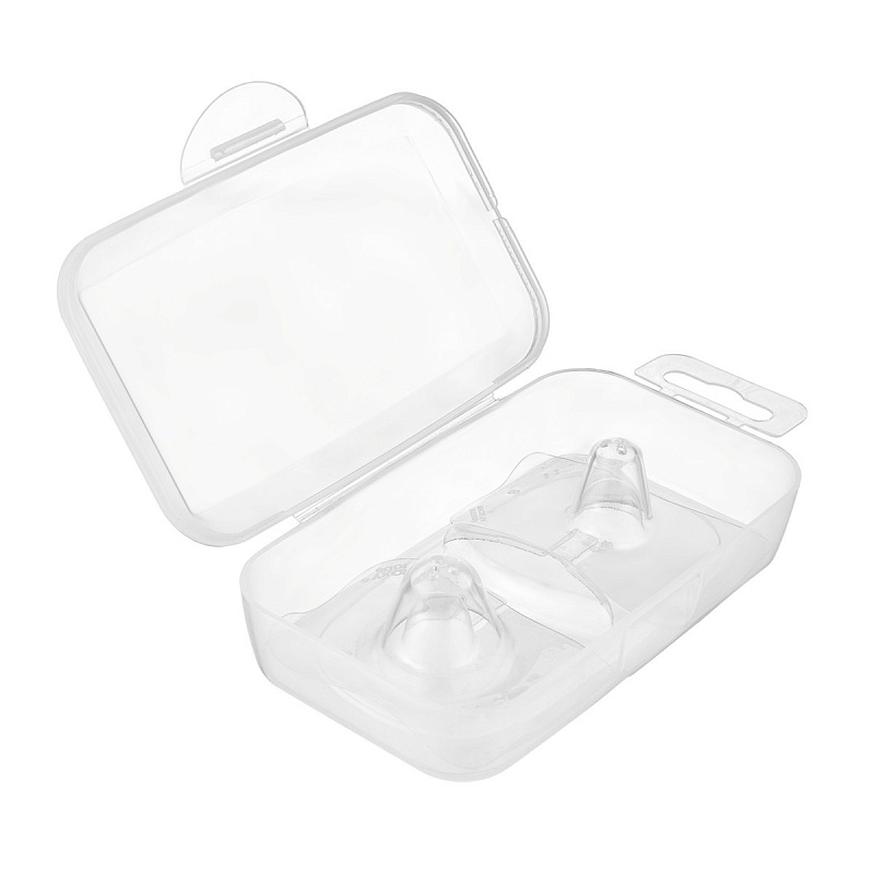 Защитные силиконовые накладки на соски избавят женщину от болезненных ощущений во время кормления грудью и защитят потрескавшиеся или воспаленные соски от травмирования. Накладки сделаны из тонкого и мягкого силикона, не имеют запаха и не влияют на вкус грудного молока. Особая форма накладок позволяет малышу ощущать запах и тепло материнской груди. После заживления сосков ребенок легко перейдет на кормление грудью без накладок. Пластиковый контейнер гарантирует удобное и гигиеничное хранение. В комплект входят 2 накладки размеров S и М. Как выбрать подходящий размер? Размер S предназначен для диаметра соска до 12 мм, а размер M для диаметра соска до 19 мм.