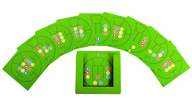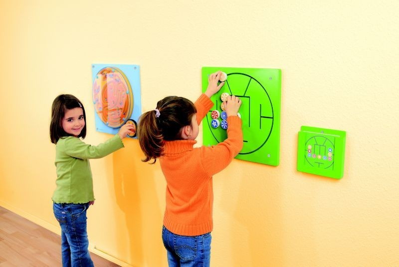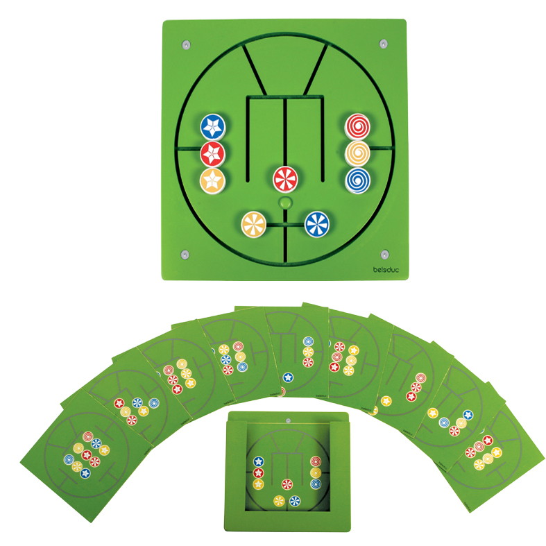 Настенный игровой элемент Beleduc Три в ряд предлагает детям собрать цветные элементы согласно карточкам-заданиям. Карточки-задания организованы в специальную навесную полку.
