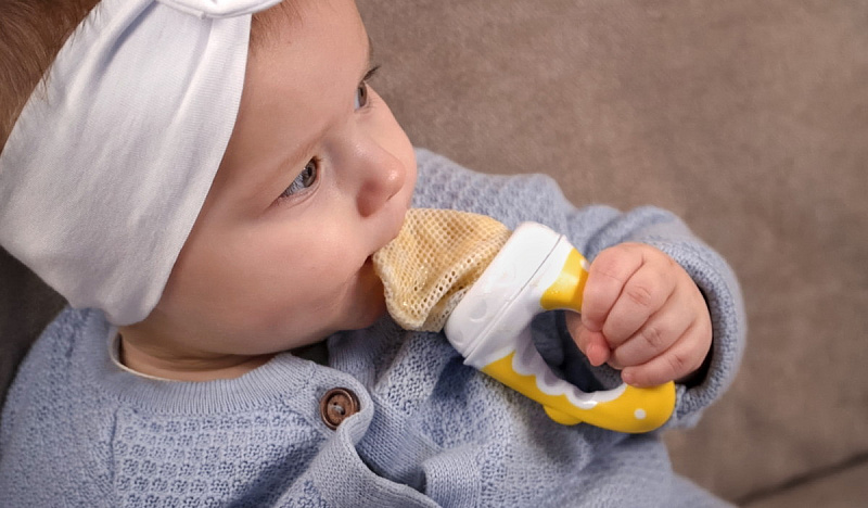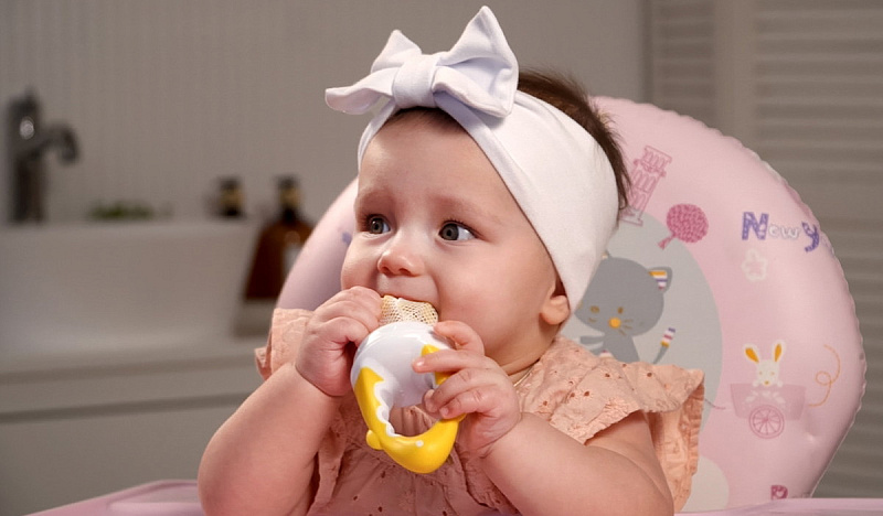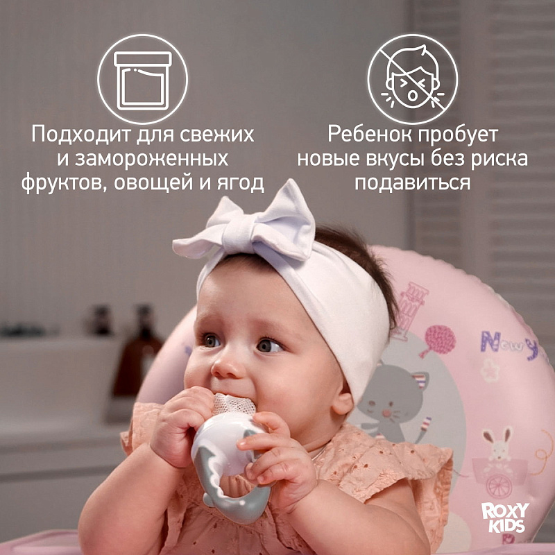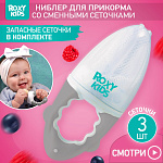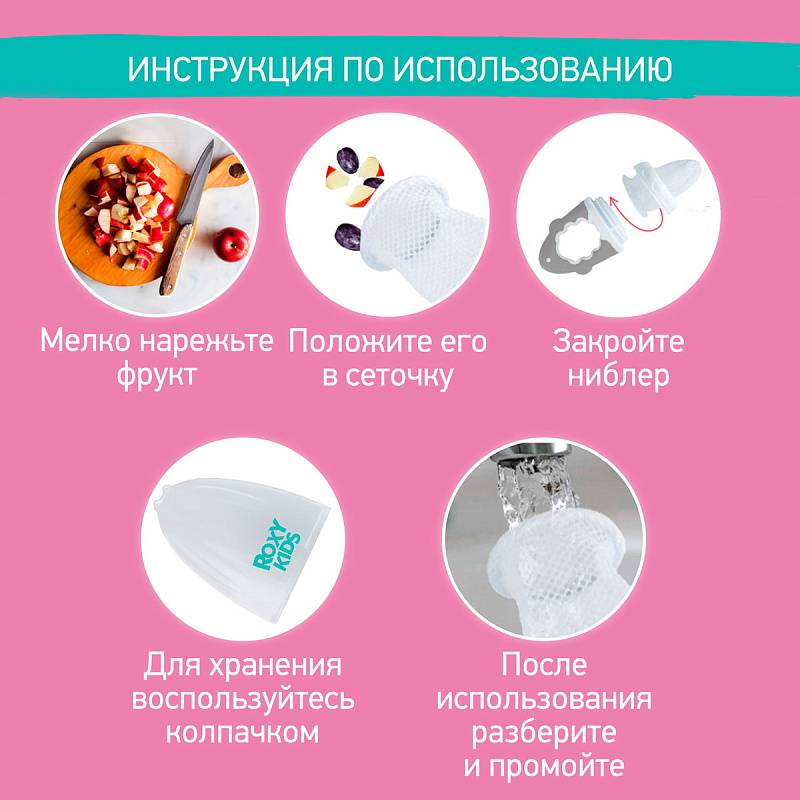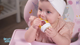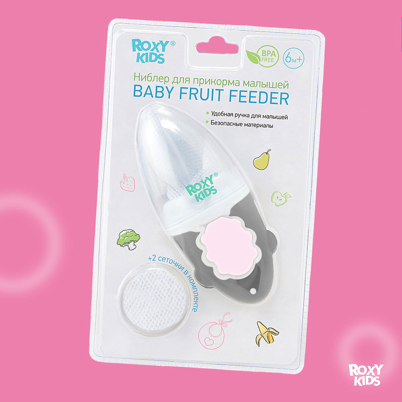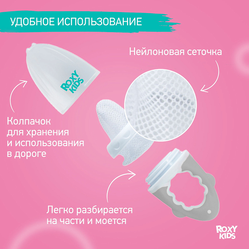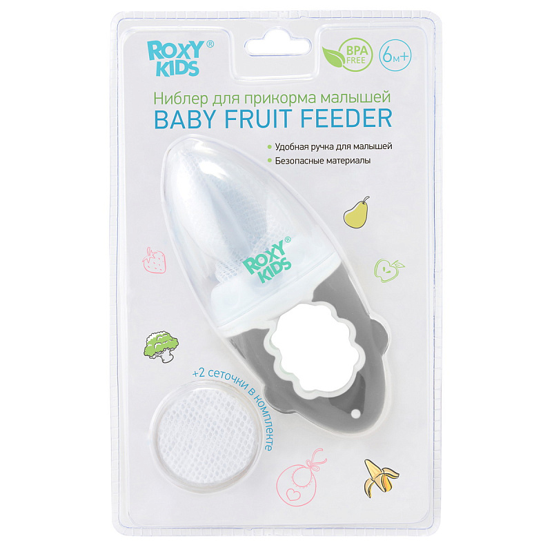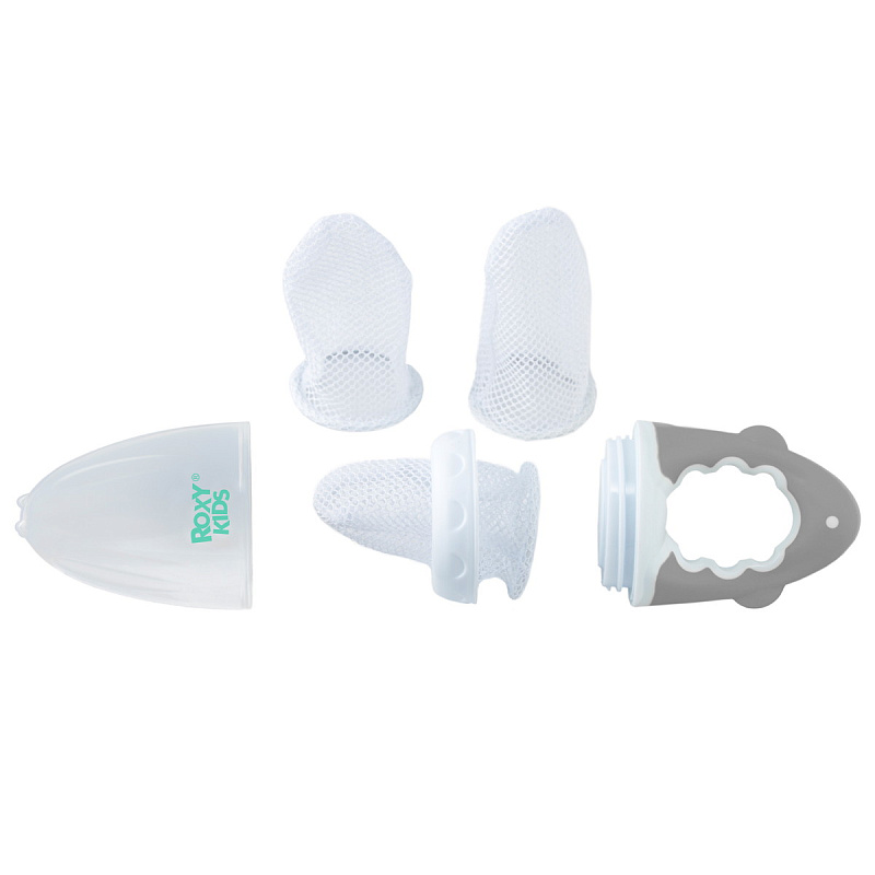 Ниблер для детей от ROXY-KIDS поможет ввести в рацион малыша свежие овощи или фрукты, печенье или хлеб. Ниблер состоит из ручки-держателя, нейлоновой сеточки и защитного колпачка, который позволит удобно хранить ниблер и брать его с собой на прогулку. Яркий держатель ниблера ROXY-KIDS удобен для детской ладошки, а прочная нейлоновая сеточка безопасна для здоровья и легко моется. В комплект ниблера входит две дополнительные сеточки, которые также можно будет докупить при необходимости.