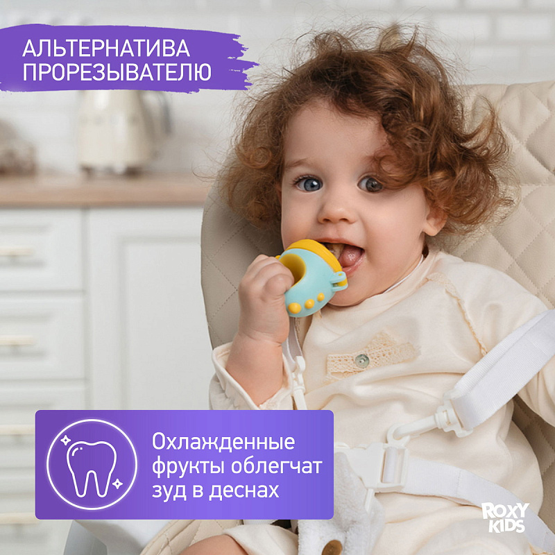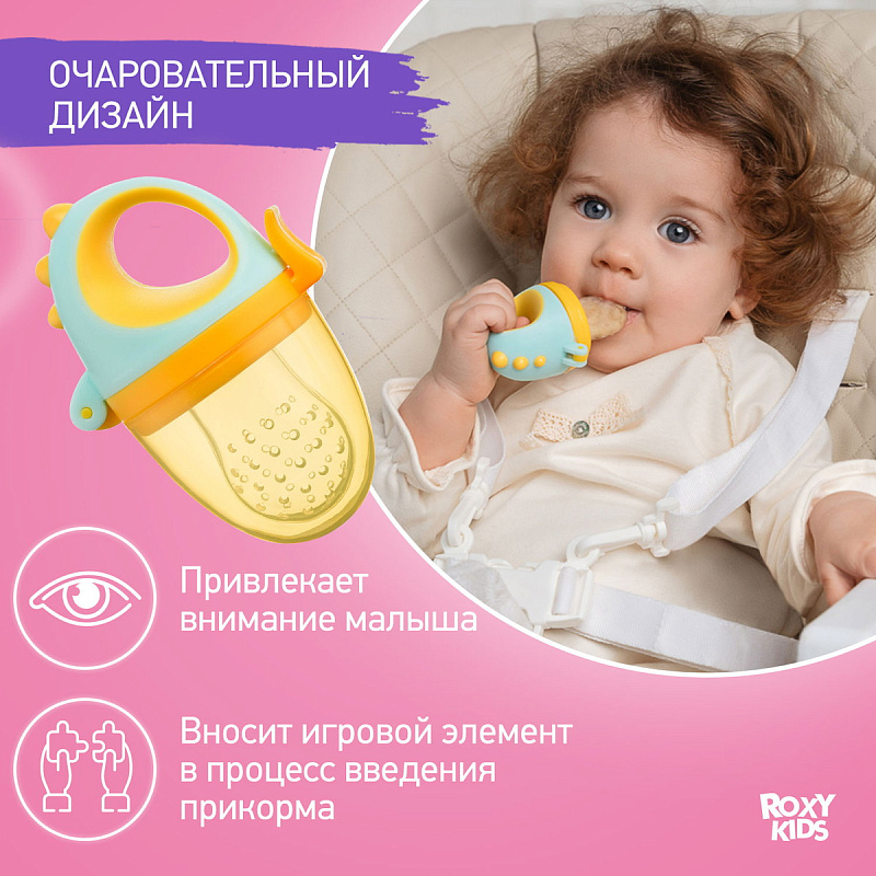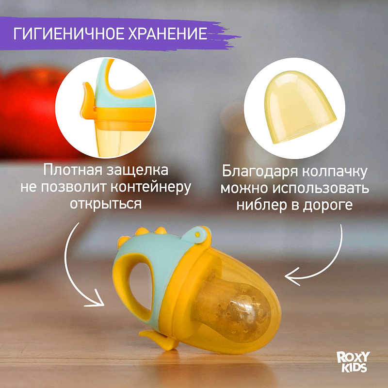 Ниблер для прикорма малышей от ROXY-KIDS поможет легко и удобно ввести в рацион малыша фрукты, овощи и печенье. Малыш сможет пробовать новые вкусы самостоятельно без риска подавиться. Размеры и форма ниблера позволят малышу легко держать устройство в маленьких ручках. Вся конструкция легко разбирается и моется под проточной водой. Силиконовая сеточка гипоаллергенна и долговечна, в случае необходимости её можно докупить и поменять. Колпачок позволит удобно хранить ниблер, а плотная защелка не даст ребенку открыть устройство во время прикорма. В ассортименте ROXY-KIDS вы сможете найти ниблеры в виде различных животных ярких цветов. Не содержит бисфенол А.
