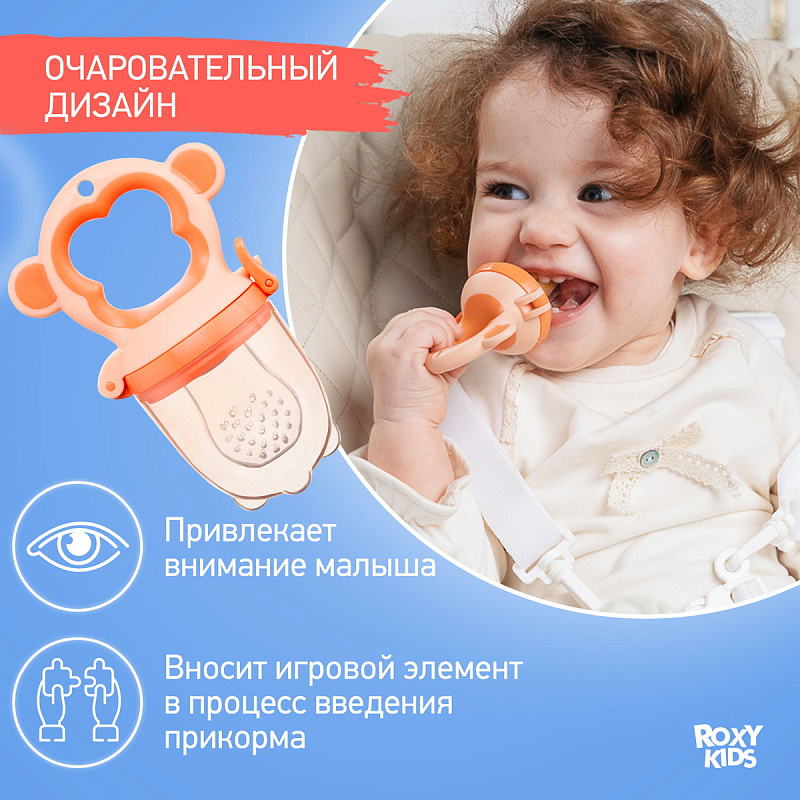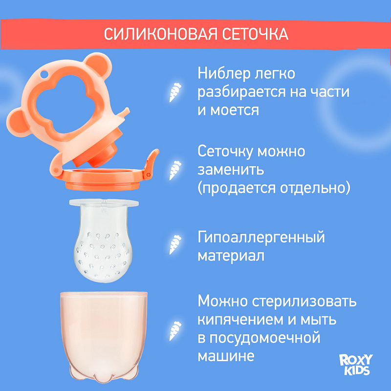 Ниблер для прикорма малышей от ROXY-KIDS поможет легко и удобно ввести в рацион малыша фрукты, овощи и печенье. Малыш сможет пробовать новые вкусы самостоятельно без риска подавиться. Размеры и форма ниблера позволят малышу легко держать устройство в маленьких ручках. Вся конструкция легко разбирается и моется под проточной водой. Силиконовая сеточка гипоаллергенна и долговечна, в случае необходимости её можно докупить и поменять. Колпачок позволит удобно хранить ниблер, а плотная защелка не даст ребенку открыть устройство во время прикорма. В ассортименте ROXY-KIDS вы сможете найти ниблеры в виде различных животных ярких цветов. Не содержит бисфенол А.