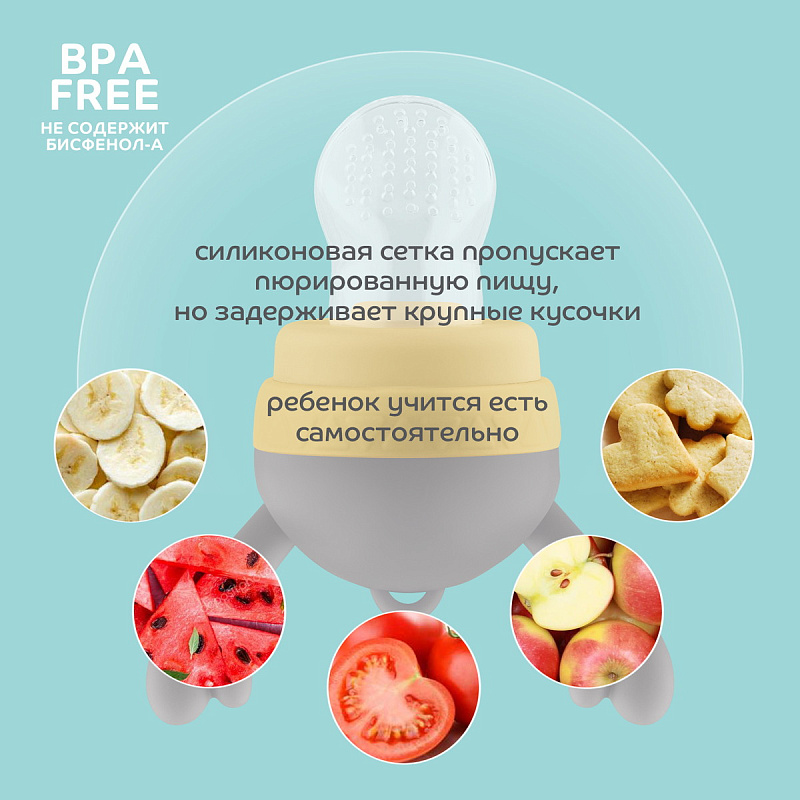 Изделие для прикорма незаменимый помощник при вводе первого прикорма. Изделие предназначено для ввода в рацион фруктов, овощей, печенья и других продуктов, соответствующих возрасту ребенка. Ребенок учится жевать и есть самостоятельно. Мягкая сеточка пропускает в виде пюре помещенные в нее продукты, минимизируя риск подавиться или поперхнутся большими кусочками.