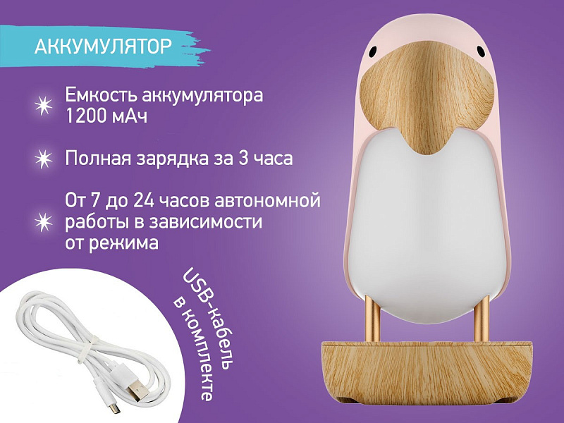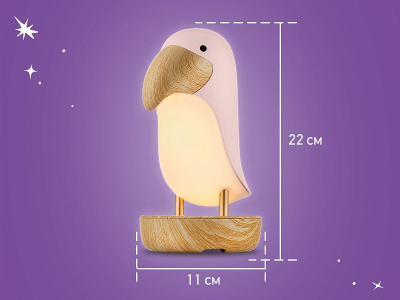 Декоративный интерьерный ночник в виде тукана создаст особую атмосферу в комнате ребенка и сделает любой интерьер уютнее. Благодаря приветливому дизайну ночник поднимает настроение малышу, успокаивает и помогает заснуть. Плавная регулировка яркости позволяет настроить нужную интенсивность света, последняя настроенная яркость сохраняется в памяти ночника. Ночник поддерживает два режима: режим постоянного свечения и режим медленного мерцания. Встроенный аккумулятор емкостью 1200 мАч обеспечивает долгое время автономной работы ночника. Ночник заряжается при помощи кабеля USB Type-C, что делает процесс зарядки очень удобным. Световой индикатор позволяет определить, когда ночник полностью заряжен. В комплект входит подробная инструкция на русском языке. Ночник поставляется в яркой премиальной упаковке, поэтому идеально подходит для подарка!