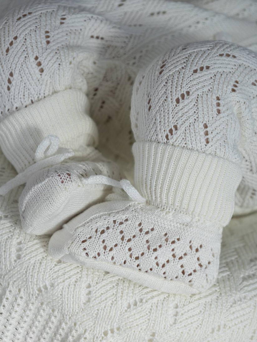 Вязаные носки для грудничков созданы с учетом нежной и чувствительной кожи малышей. Модель выполнена из мягкой пряжи, которая обеспечивает комфорт и приятные ощущения при носке. Основной цвет изделия — спокойный, универсальный, гармонично сочетающийся с разной детской одеждой. Вязаная структура изделия обладает аккуратным ажурным узором, который не только украшает носки, но и способствует циркуляции воздуха, предотвращая перегрев ножек. Высокая эластичная резинка хорошо фиксирует носки на ножке, не сдавливает и не оставляет следов, что особенно важно для грудничков. Текстура мягкая, без грубых швов и раздражающих элементов. Благодаря продуманной конструкции, носки удобно надевать и снимать, а также носить в течение длительного времени. Они подходят для ежедневного использования дома и на прогулке, обеспечивают тепло и уют даже в прохладную погоду. Классический дизайн и аккуратная отделка подчеркивают качество исполнения.