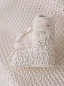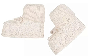Детские вязаные носочки будут находкой для мамы в любое время года. Вязка выглядит стильно и напоминает плотную фактурную ткань. Модель хорошо тянется, завязочки фиксируют модель на ножке. Носочки красиво смотрятся и сохранят ножки в тепле.