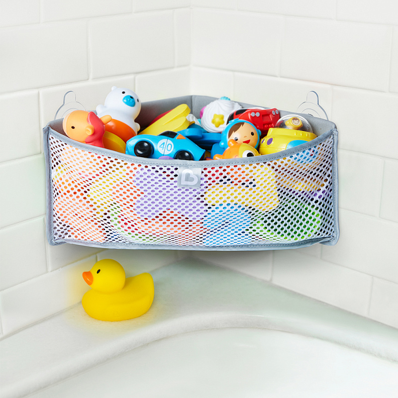 Компактный угловой дизайн увеличивает пространство для хранения игрушек для ванны (игрушки в комплект не входят).