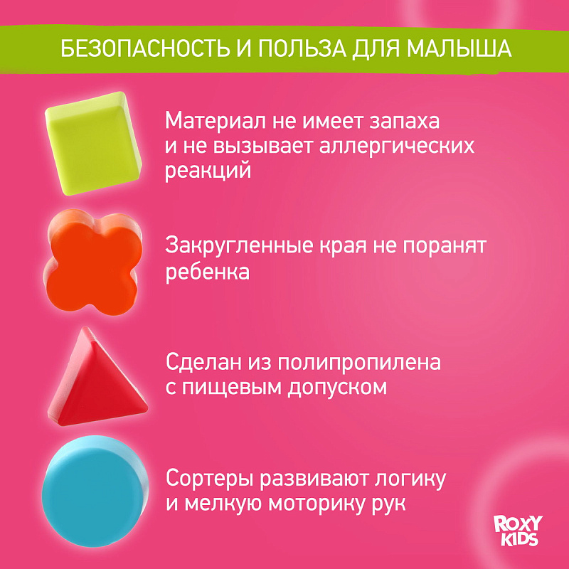 - может использоваться в качестве развивающей игры - 4 отверстия выполнены в виде фигур, и в комплект включены 4 сортера