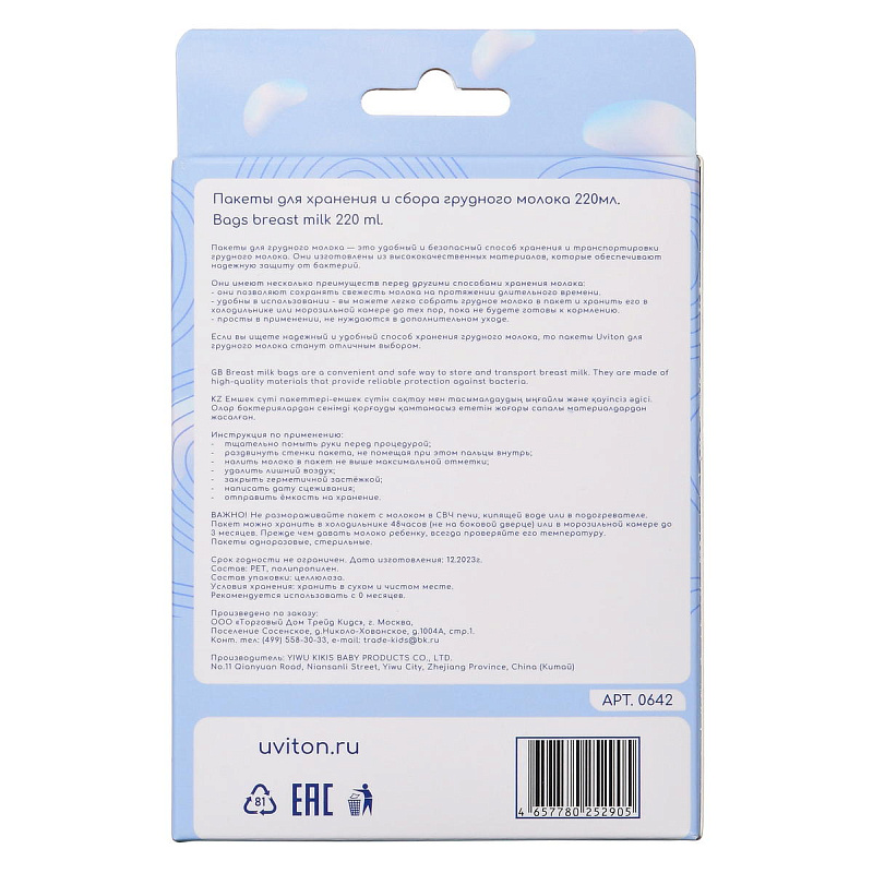 Пакеты для грудного молока Uviton 220 мл 30 штНет оценокХарактеристики