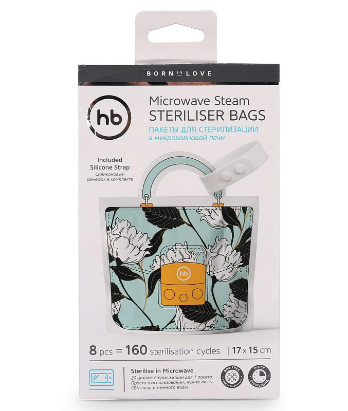 Пакеты для стерилизации в микроволновой печи Happy Baby позволяют быстро и удобно простерилизовать соски и пустышки, зубные щетки, детские аксессуары. При такой стерилизации не образуется налета, как при кипячении. Процесс стерилизации не вызовет проблем. Сложите предметы в стерилизатор пакет, налейте 20мл воды, плотно закройте пакет и положите его в микроволновую печь. Уже через несколько минут все микробы и бактерии будут уничтожены. Пакеты многоразовые, а также их можно взять с собой, подвесив с помощью силиконового ремешка. 20 циклов стерилизации для 1 пакета. В упаковке 8 пакетов. Рекомендуем стерилизовать 1,5 мин при мощности более 1100 Вт, 3 минуты при мощности 800-1100 Вт, 5 минут при 600-750 Вт.