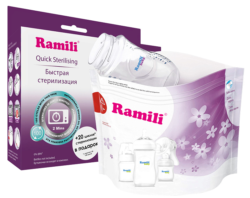 В одной коробке 6 пакетов – это до 120 циклов стерилизации. Пакеты Ramili® Baby RSB110 заменяют собой традиционный паровой стерилизатор. Они компактны, их удобно взять с собой в поездку, на дачу, использовать там, где обычный стерилизатор недоступен. В вашем распоряжении всегда будут стерильные детские бутылочки, молокоотсос и прочие аксессуары для кормления, подходящие для паровой стерилизации, где бы вы ни находились.