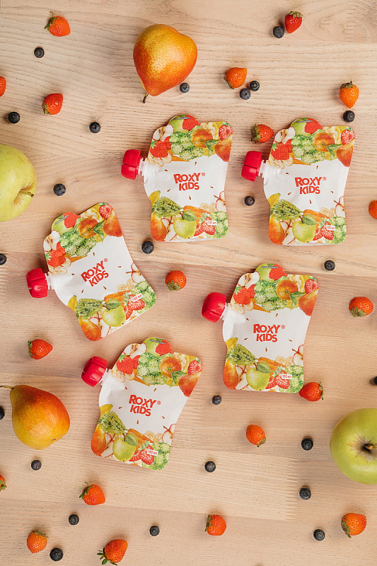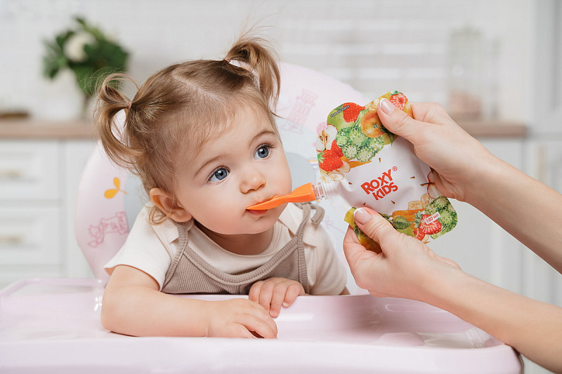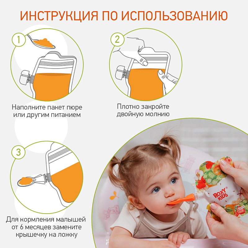 Многоразовые пакеты ROXY-KIDS с ложечкой для детского питания – находка для прогулок с детьми! Теперь вы сможете брать с собой свежее фруктовое пюре собственного приготовления или порционно распределять детское питание из больших упаковок. Благодаря широкому горлышку пакетик удобно наполнять фруктовым или овощным пюре, кашей, смузи, йогуртом и мягким творогом. Двойная молния плотно застегивается и не открывается даже при сильном нажатии. Бонус – ложечка-накрутка для кормления детей от 6 месяцев. Пюре поступает в ложку небольшими порциями, поэтому маме удобно кормить малыша даже на прогулке!