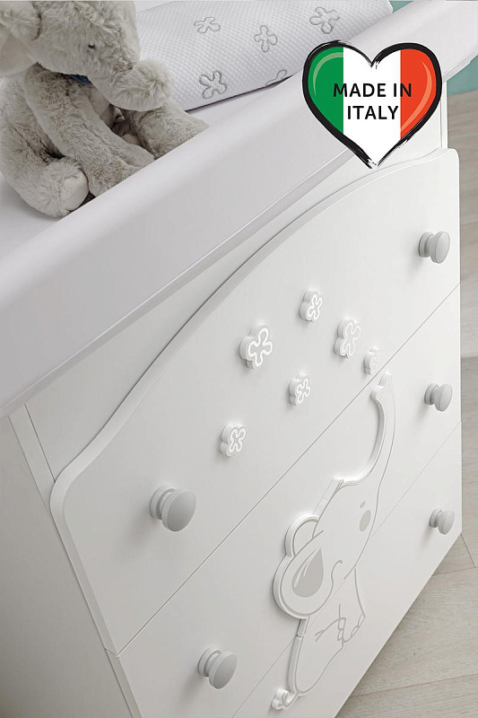 Пеленальный комод Erbesi Elly – это итальянское качество и внимание к деталям, а также практичное и стильное решение для обустройства комнаты для новорожденного. Изготовленный из высококачественной ДСП класса E1 с низким уровнем эмиссии формальдегида и покрытой ПВХ, он соответствует европейским стандартам безопасности и отличается особой прочностью и долговечностью.