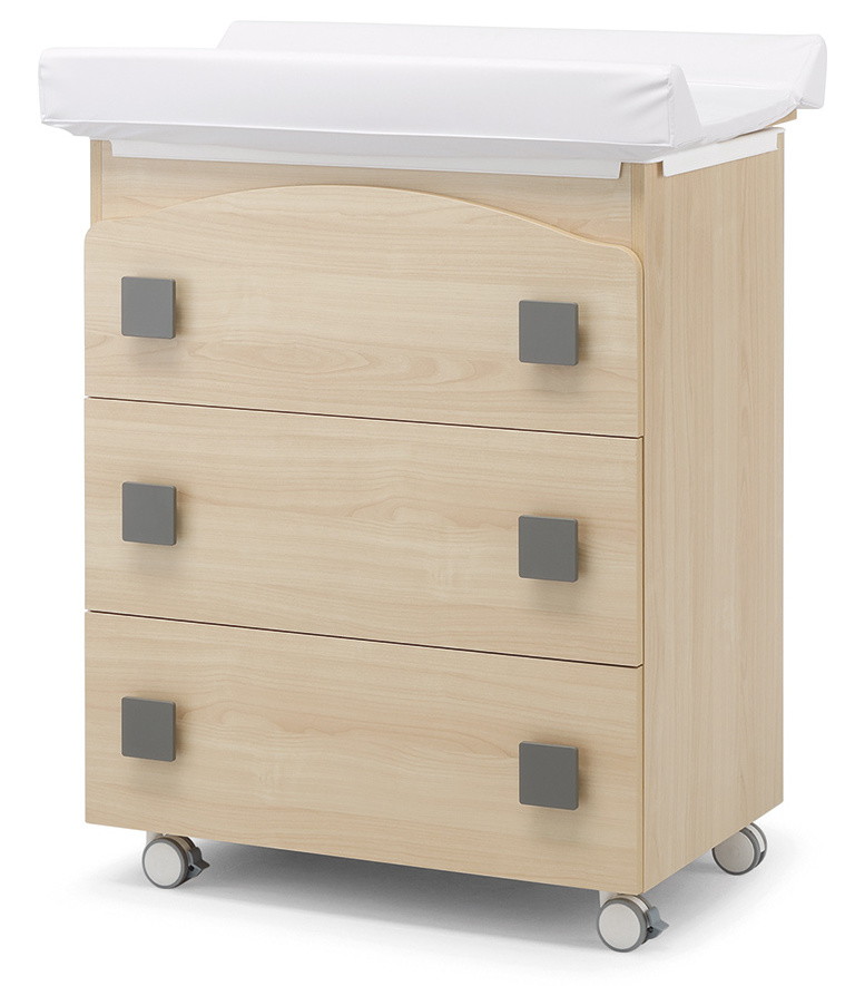 Комод Erbesi Evolution является универсальным решением, объединяющим в себе функции комода, пеленального столика и ванночки. Он оснащен тремя вместительными ящиками на металлических направляющих, что позволяет удобно хранить все необходимые вещи для ухода за малышом. Верхняя крышка открывается, предоставляя доступ к встроенной ванночке, что делает использование комода еще более практичным.