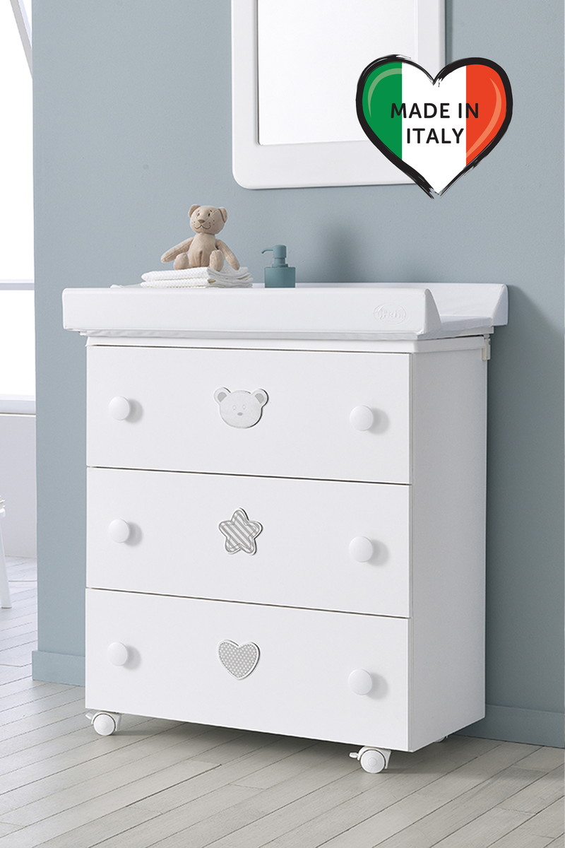 • Съемная пеленальная подушка с 2 приподнятыми боковинами безопасности, соответствующая европейским стандартам.
