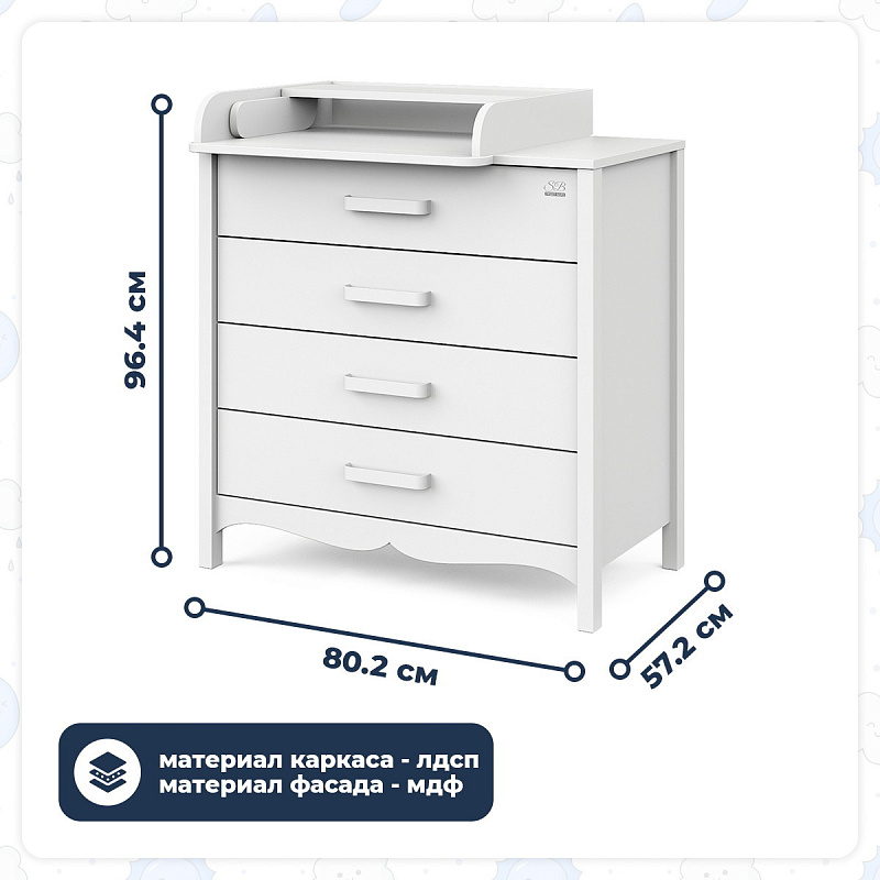 Корпус детского пеленального комода Sweet Baby Maestro изготовлен из ЛДСП цвета «Аляска белая».