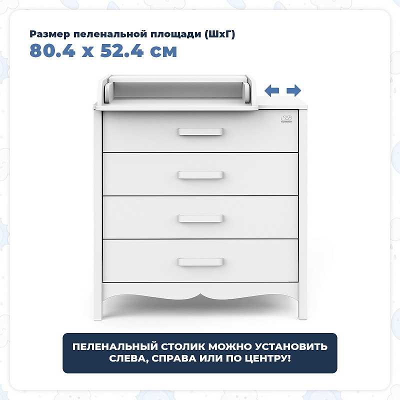 Отличительной особенностью комода является возможность устанавливать раскладной пеленальный столик слева, справа или по центру - как вам удобно!