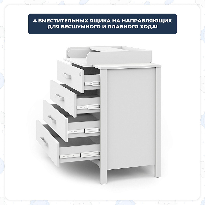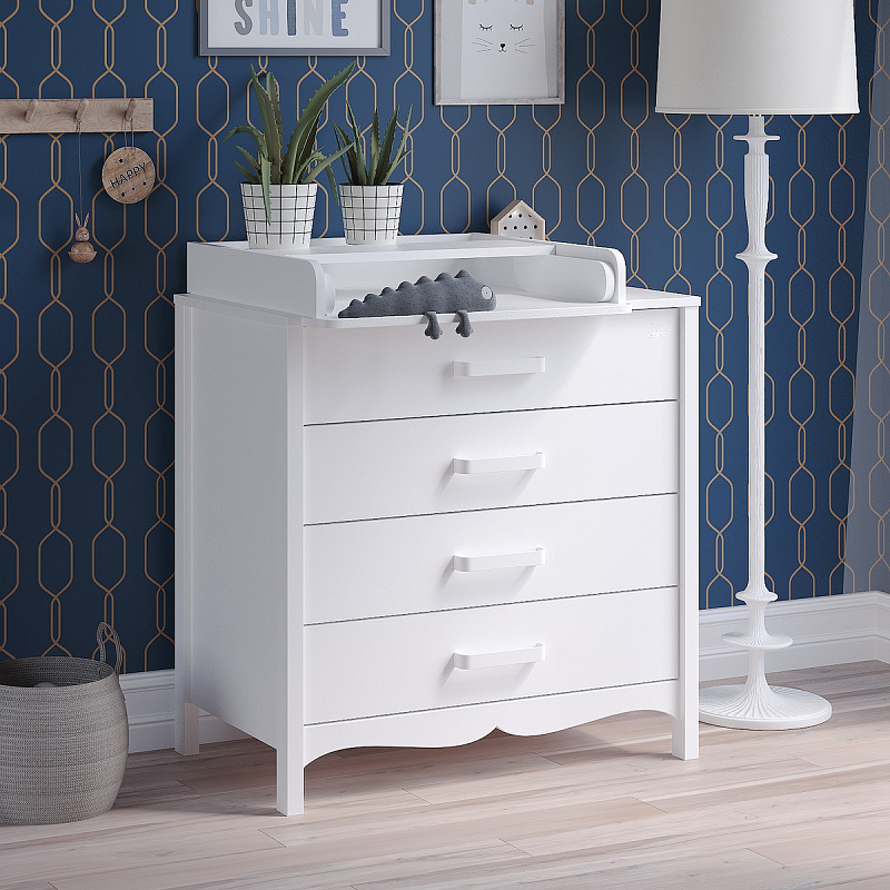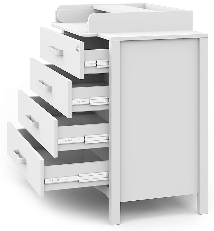 Фасад ящиков комода для пеленания выполнен из МДФ, покрытого белым матовым цветом.