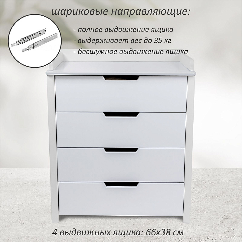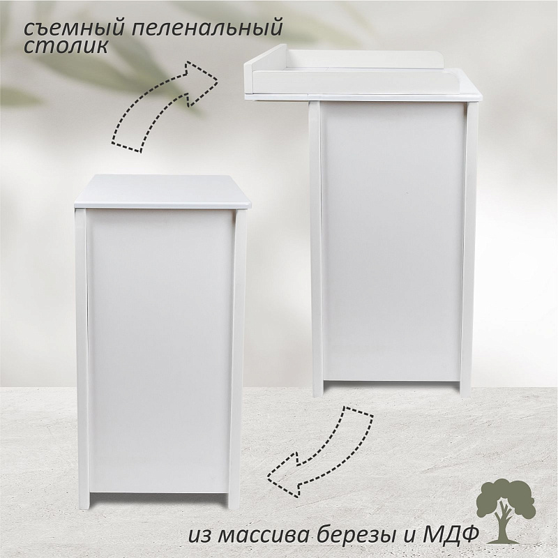 Стильный комод выполнен в скандинавском стиле. Комод оригинально смотрится и прекрасно впишется в любой интерьер. Современные лакокрасочные материалы, использованные в отделке, нетоксичны и долговечны, а конструкция не имеет острых углов, что не только «смягчает» ее очертания, но и бережет малыша от случайных травм.