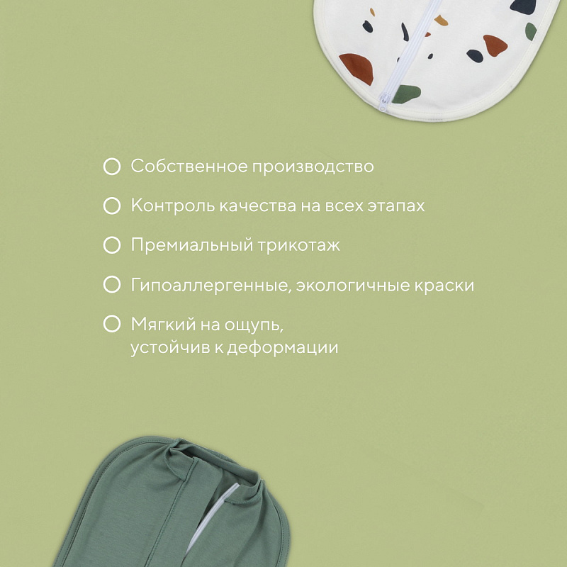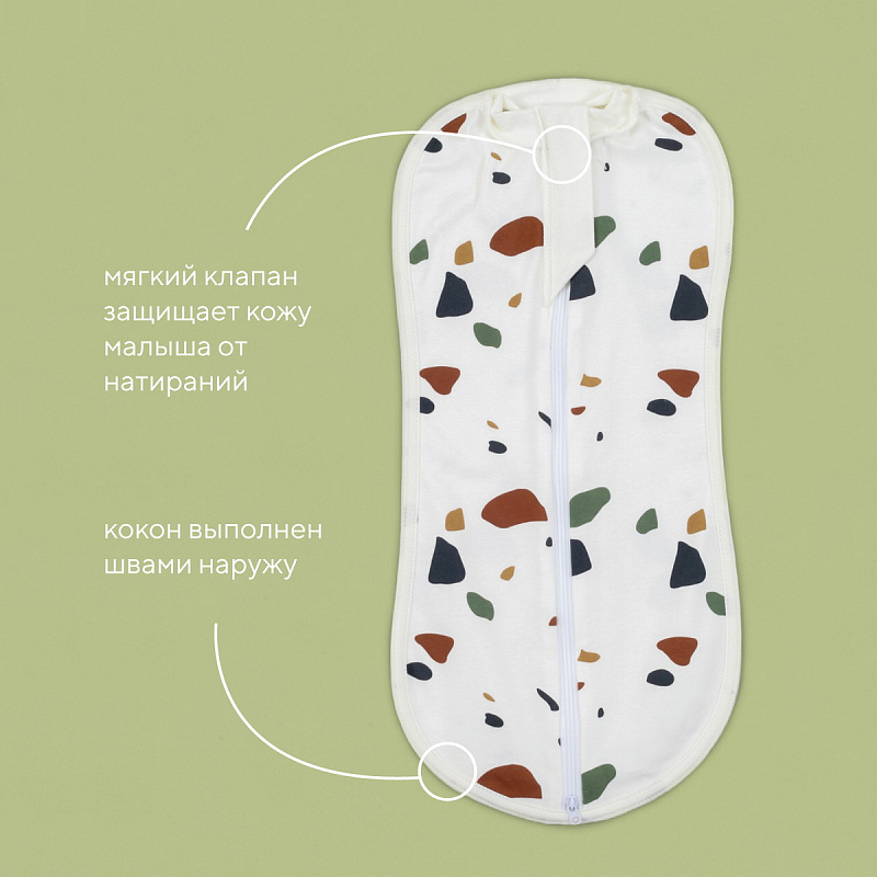Пеленка-кокон из этой коллекции - идеальное решение для спокойного сна с самого рождения, ведь малыш не разбудит сам себя ручками. Изделие не требует навыков пеленания, обеспечивает комфортное положение крохи. Маленький подбородок защищен мягким клапаном от бегунка молнии. Молния с двойным ходом - изделие можно расстегнуть снизу для комфортной смены подгузника. Модель выполнена швами наружу, чтобы не раздражать нежную кожу младенца.